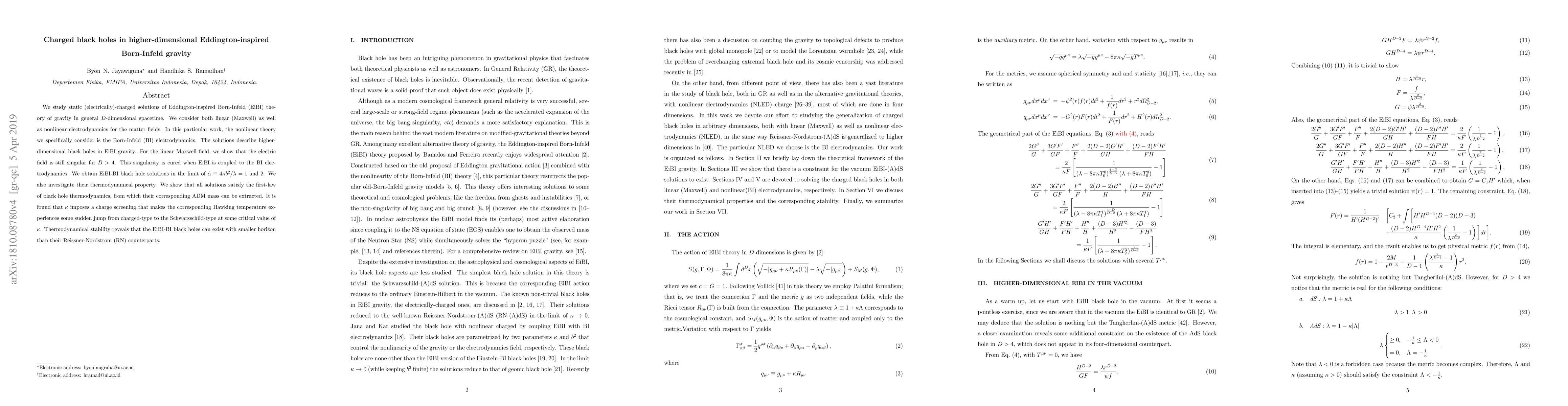 We study static (electrically)-charged solutions of Eddington-inspired Born-Infeld (EiBI) theory of gravity in general $D$-dimensional spacetime. We consider both linear (Maxwell) as well as nonlinear electrodynamics for the matter fields. In this particular work, the nonlinear theory we specifically consider is the Born-Infeld electrodynamics. The solutions describe higher-dimensional black holes in EiBI gravity. For the linear Maxwell field, we show that the electric field is still singular for $D>4$. This singularity is cured when EiBI is coupled to the BI electrodynamics. We obtain EiBI-BI black hole solutions in the limit of ${\tilde\alpha}\equiv4\kappa b^2/\lambda=1$ and $2$. We also investigate their thermodynamical property. It is found that $\kappa$ imposes a charge screening that makes the corresponding Hawking temperature experiences some sudden jump from charged-type to the Schwarzschild-type at some critical value of $\kappa$. Thermodynamical stability reveals that the EiBI-BI black holes can exist with smaller horizon than the RN.
