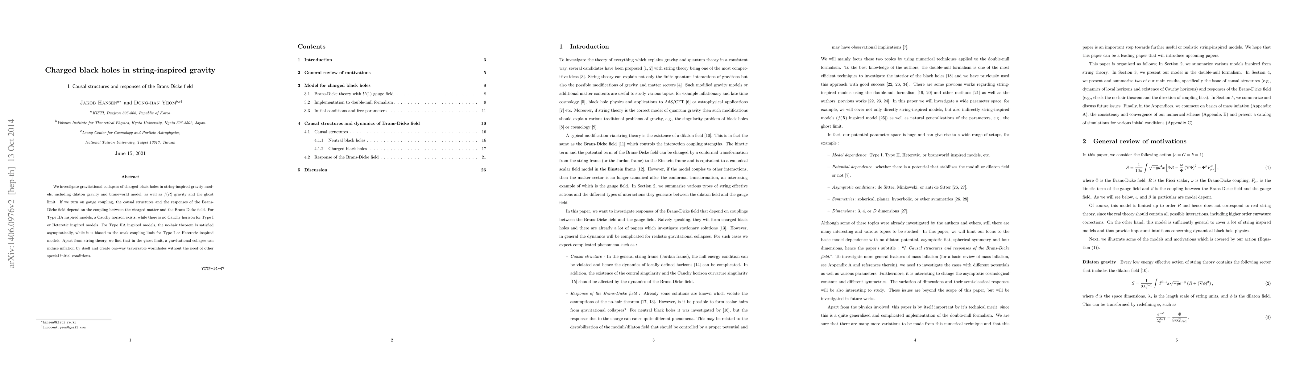 This paper explores the causal structures of charged black holes in string-inspired gravity models, revealing that the presence of a Cauchy horizon and the validity of the no-hair theorem depend on the coupling between charged matter and the Brans-Dicke field. It also finds that a gravitational collapse in the ghost limit can induce inflation and create traversable wormholes.