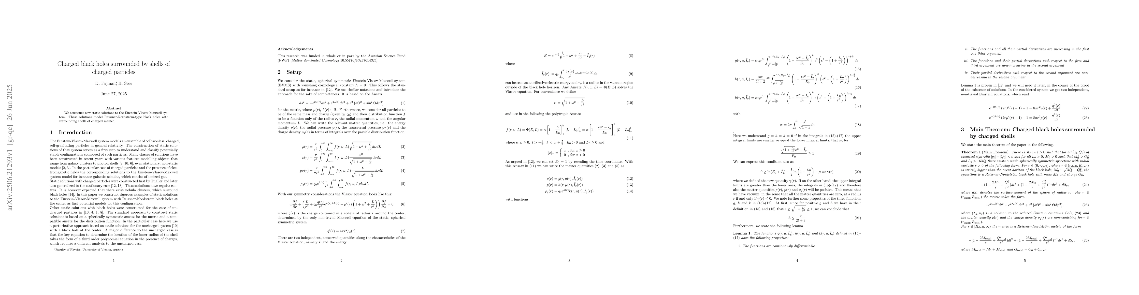 The paper provides a detailed mathematical proof of the existence and bounded support of charged shell solutions in the Einstein-Vlasov-Maxwell system, including explicit bounds and solution extension criteria.