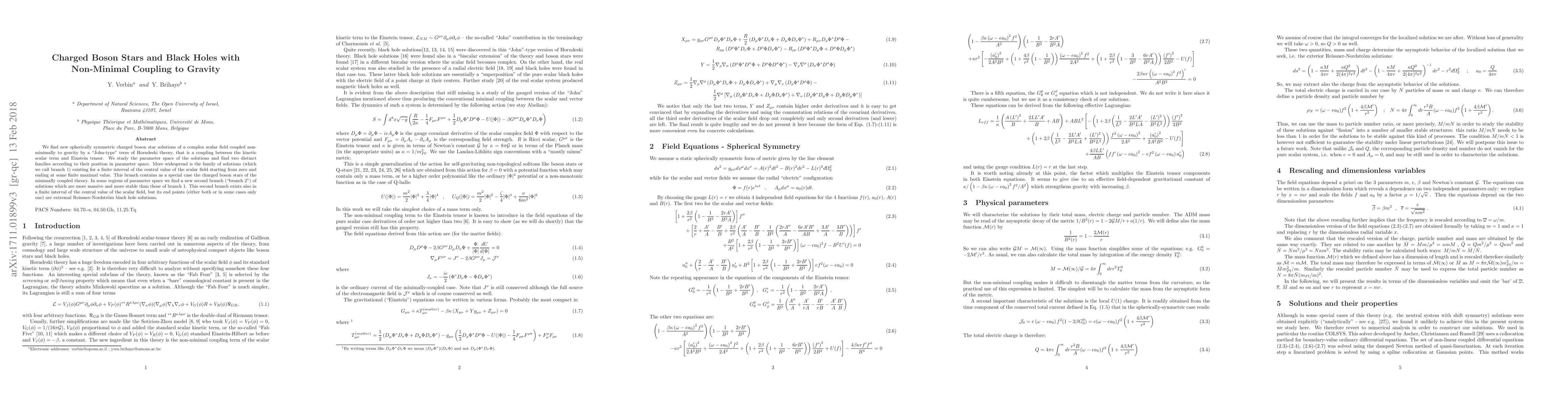 We find new spherically symmetric charged boson star solutions of a complex scalar field coupled non-minimally to gravity by a "John-type" term of Horndeski theory, that is a coupling between the kinetic scalar term and Einstein tensor. We study the parameter space of the solutions and find two distinct families according to their position in parameter space. More widespread is the family of solutions (which we call branch 1) existing for a finite interval of the central value of the scalar field starting from zero and ending at some finite maximal value. This branch contains as a special case the charged boson stars of the minimally coupled theory. In some regions of parameter space we find a new second branch ("branch 2") of solutions which are more massive and more stable than those of branch 1. This second branch exists also in a finite interval of the central value of the scalar field, but its end points (either both or in some cases only one) are extremal Reissner-Nordstrom black hole solutions.