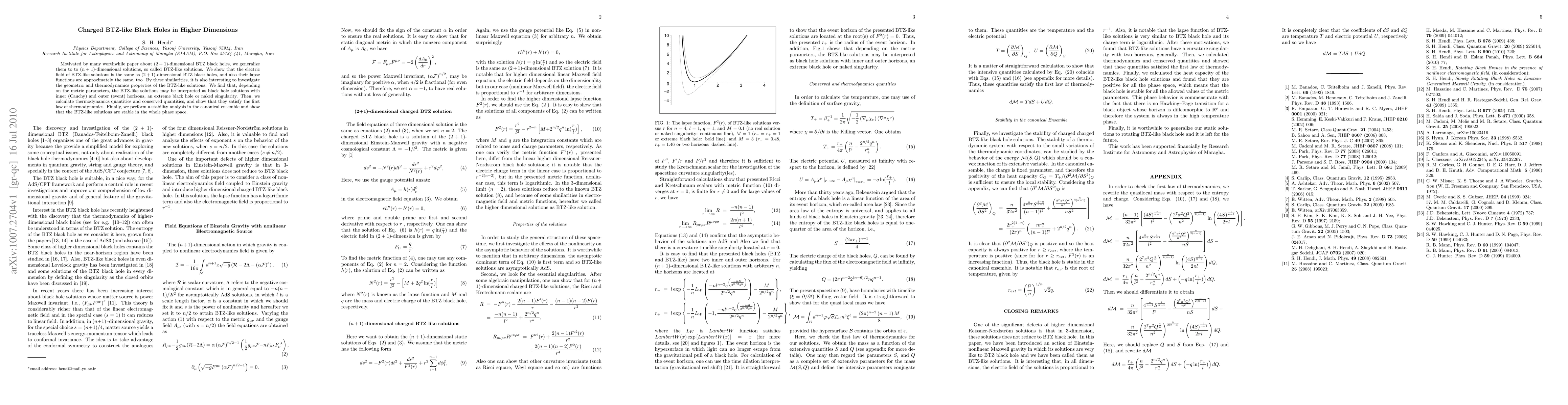Motivated by many worthwhile paper about (2 + 1)-dimensional BTZ black holes, we generalize them to to (n + 1)-dimensional solutions, so called BTZ-like solutions. We show that the electric field of BTZ-like solutions is the same as (2 + 1)-dimensional BTZ black holes, and also their lapse functions are approximately the same, too. By these similarities, it is also interesting to investigate the geometric and thermodynamics properties of the BTZ-like solutions. We find that, depending on the metric parameters, the BTZ-like solutions may be interpreted as black hole solutions with inner (Cauchy) and outer (event) horizons, an extreme black hole or naked singularity. Then, we calculate thermodynamics quantities and conserved quantities, and show that they satisfy the first law of thermodynamics. Finally, we perform a stability analysis in the canonical ensemble and show that the BTZ-like solutions are stable in the whole phase space.
