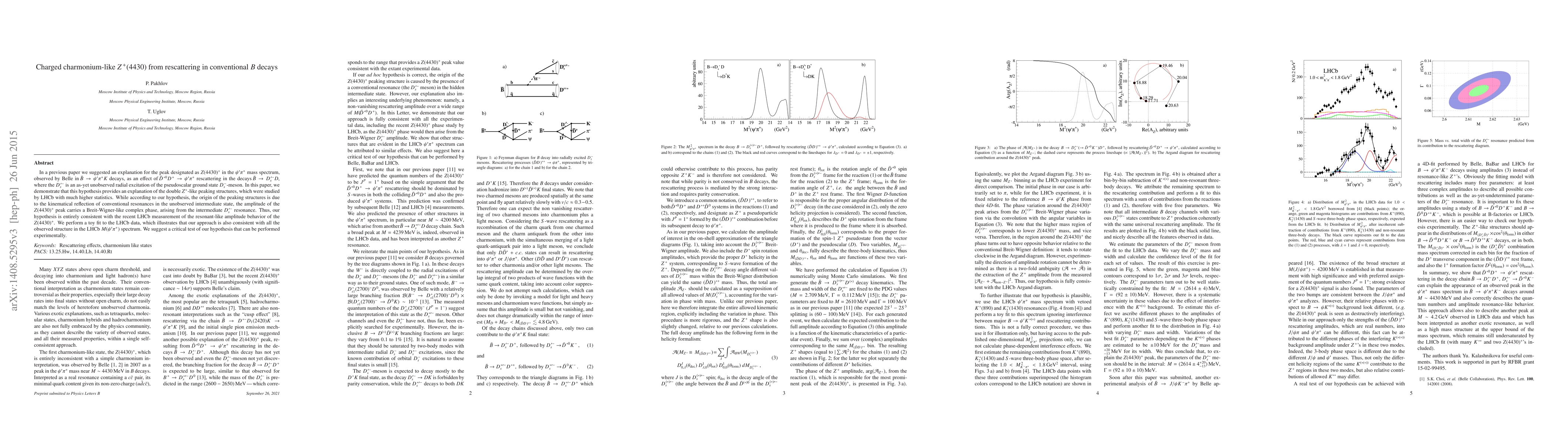 In a previous paper we suggested an explanation for the peak designated as $Z(4430)^+$ in the $\psi^\prime\pi^+$ mass spectrum, observed by Belle in ${\bar{\!B}} \to {\psi^\prime} \pi^+ K$ decays, as an effect of $\bar{\!D}{}^{\,*0}D^{\,+} \to \psi^\prime\pi^+$ rescattering in the decays ${\bar{\!B}} \to {D_{s}^{\,\prime -}} {D}$, where the $D_{s}^{\,\prime -}$ is an as-yet unobserved radial excitation of the pseudoscalar ground state $D_{s}^{\,-}$-meson. In this paper, we demonstrate that this hypothesis provides an explanation of the double $Z^+$-like peaking structures, which were studied by LHCb with much higher statistics. While according to our hypothesis, the origin of the peaking structures is purely kinematical, reflecting the presence of a conventional resonance in the hidden intermediate state, the amplitude of the $Z(4430)^+$ peak carries a Breit-Wigner-like complex phase, arising from the intermediate $D_{s}^{\,\prime -}$ resonance. Thus, our hypothesis is entirely consistent with the recent LHCb measurement of the resonant-like amplitude behaviour of the $Z(4430)^+$. We perform a toy fit to the LHCb data, which illustrates that our approach is also consistent with all the observed structure in the LHCb $M({{\psi^\prime}\pi^+})$ spectrum. We suggest a critical test of our hypothesis that can be performed experimentally.