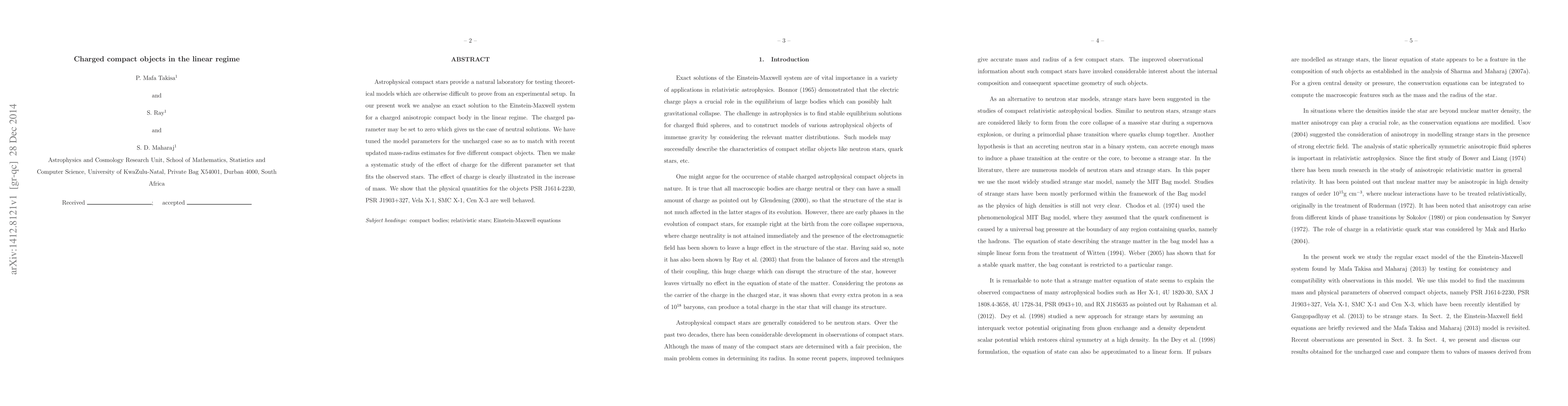 Astrophysical compact stars provide a natural laboratory for testing theoretical models which are otherwise difficult to prove from an experimental setup. In our present work we analyse an exact solution to the Einstein-Maxwell system for a charged anisotropic compact body in the linear regime. The charged parameter may be set to zero which gives us the case of neutral solutions. We have tuned the model parameters for the uncharged case so as to match with recent updated mass-radius estimates for five different compact objects. Then we make a systematic study of the effect of charge for the different parameter set that fits the observed stars. The effect of charge is clearly illustrated in the increase of mass. We show that the physical quantities for the objects PSR J1614-2230, PSR J1903+327, Vela X-1, SMC X-1, Cen X-3 are well behaved.