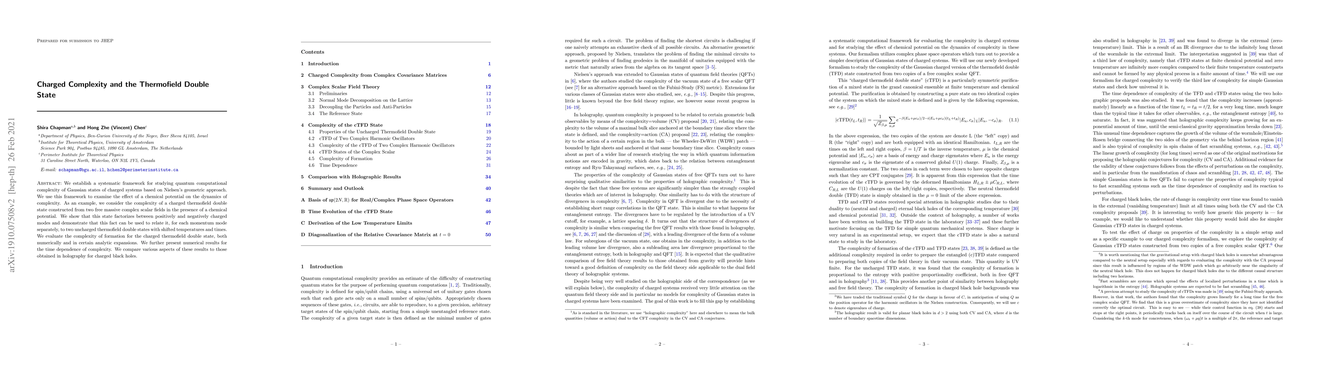 This paper develops a framework for understanding quantum computational complexity in charged systems using Nielsen's geometric approach, demonstrating that a charged thermofield double state factorizes between charged modes, and evaluates its complexity numerically and analytically, comparing results to those of charged black holes in holography.