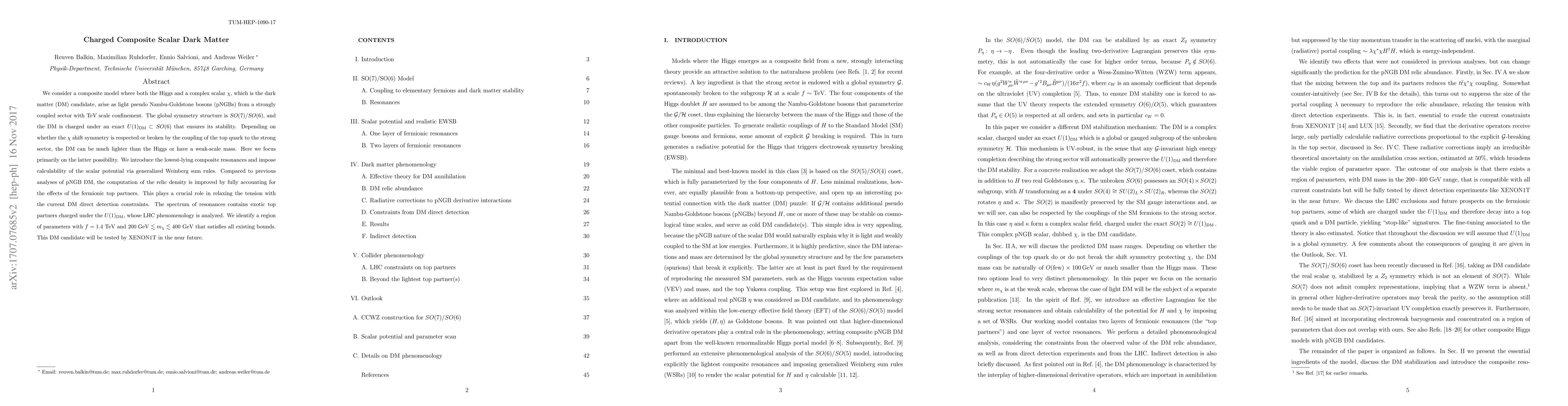 We consider a composite model where both the Higgs and a complex scalar $\chi$, which is the dark matter (DM) candidate, arise as light pseudo Nambu-Goldstone bosons (pNGBs) from a strongly coupled sector with TeV scale confinement. The global symmetry structure is $SO(7)/SO(6)$, and the DM is charged under an exact $U(1)_{\rm DM} \subset SO(6)$ that ensures its stability. Depending on whether the $\chi$ shift symmetry is respected or broken by the coupling of the top quark to the strong sector, the DM can be much lighter than the Higgs or have a weak-scale mass. Here we focus primarily on the latter possibility. We introduce the lowest-lying composite resonances and impose calculability of the scalar potential via generalized Weinberg sum rules. Compared to previous analyses of pNGB DM, the computation of the relic density is improved by fully accounting for the effects of the fermionic top partners. This plays a crucial role in relaxing the tension with the current DM direct detection constraints. The spectrum of resonances contains exotic top partners charged under the $U(1)_{\rm DM}$, whose LHC phenomenology is analyzed. We identify a region of parameters with $f = 1.4\; \mathrm{TeV}$ and $200\;\mathrm{GeV} \lesssim m_\chi \lesssim 400\;\mathrm{GeV}$ that satisfies all existing bounds. This DM candidate will be tested by XENON1T in the near future.