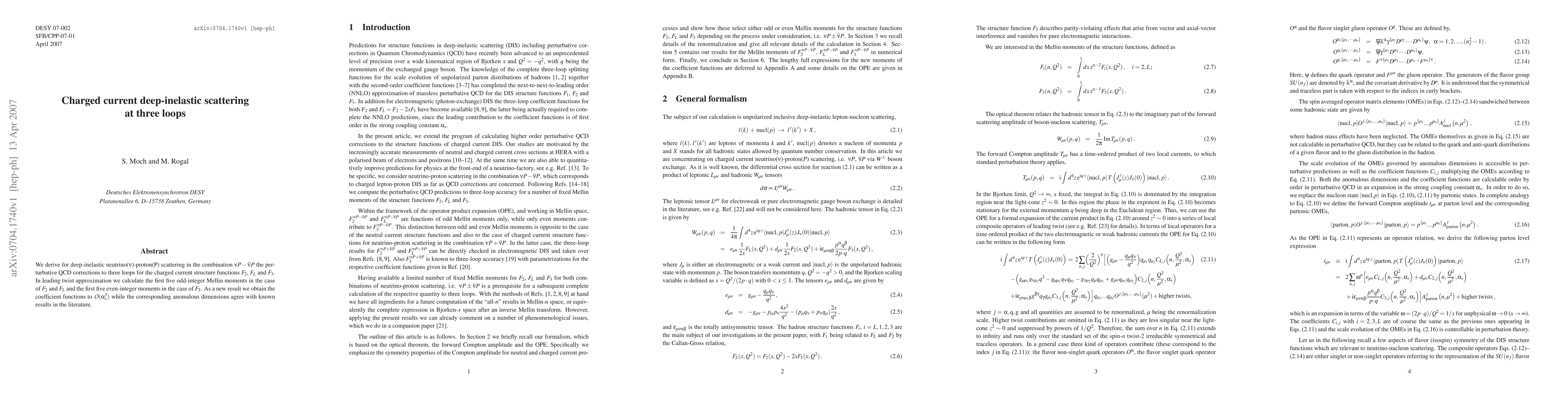 This paper derives three-loop perturbative QCD corrections for charged current deep-inelastic neutrino-proton scattering, focusing on structure functions F_2, F_L, and F_3. It calculates the first five odd-integer moments for F_2 and F_L, and the first five even-integer moments for F_3, presenting new results for coefficient functions to O(α_s^3).