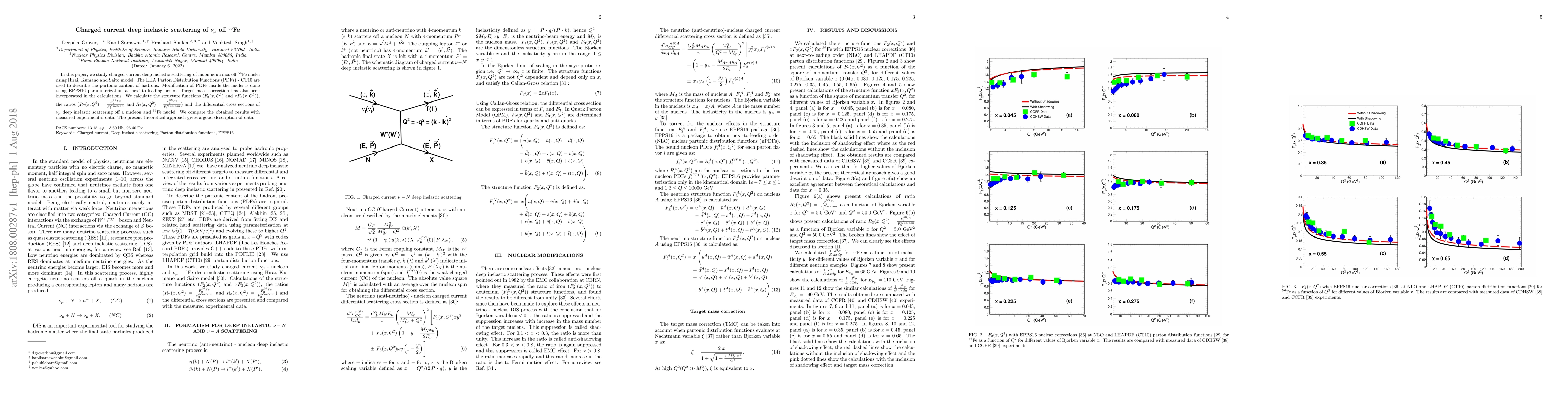 In this paper, we study charged current deep inelastic scattering of muon neutrinos off ^{56}Fe nuclei using Hirai, Kumano and Saito model. The LHA Parton Distribution Functions (PDFs) - CT10 are used to describe the partonic content of hadrons. Modification of PDFs inside the nuclei is done using EPPS16 parameterization at next-to-leading order. Target mass correction has also been incorporated in the calculations. We calculate the structure functions (F_{2}(x,Q^{2}) and xF_{3}(x,Q^{2})), the ratios (R_{2}(x,Q^{2}) = \frac{F^{^{56}Fe}_{2}}{F^{Nucleon}_{2}} and R_{3}(x,Q^{2}) = \frac{F^{^{56}Fe}_{3}}{F^{Nucleon}_{3}}) and the differential cross sections of muon neutrino deep inelastic scattering off a nucleon and ^{56}Fe nuclei. We compare the obtained results with measured experimental data. The present theoretical approach gives a good description of data.