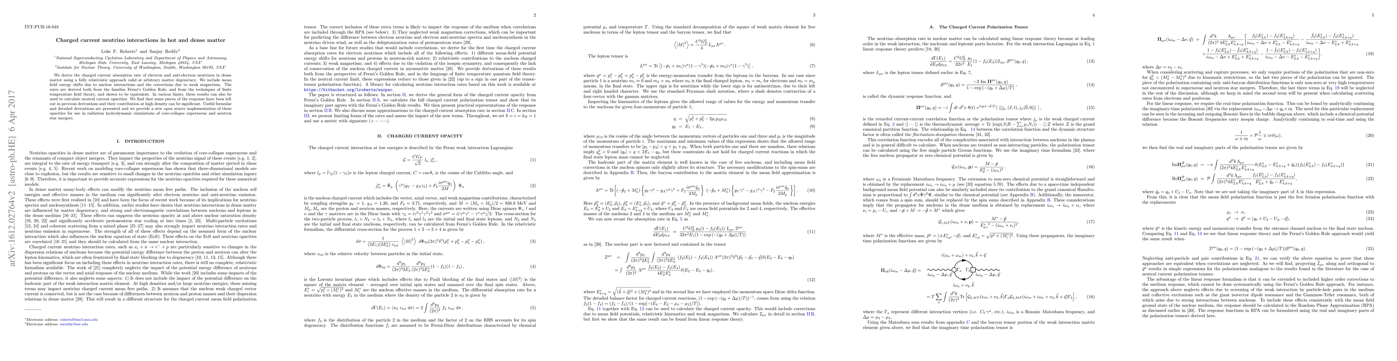 This paper derives the charged current absorption rates for electron and anti-electron neutrinos in dense matter using relativistic methods, revealing significant omissions in previous derivations. It provides a new open-source implementation for simulating these interactions in core-collapse supernovae and neutron star mergers.