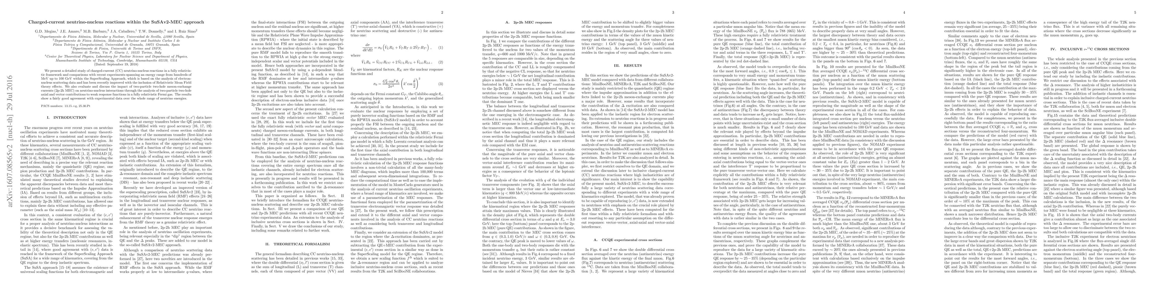 This paper studies charged-current neutrino-nucleus reactions within a relativistic framework using the improved SuperScaling Approach (SuSAv2-MEC), incorporating Relativistic Mean Field theory and two-particle two-hole meson-exchange currents. The results demonstrate good agreement with experimental data across a broad energy range from MeV to GeV.