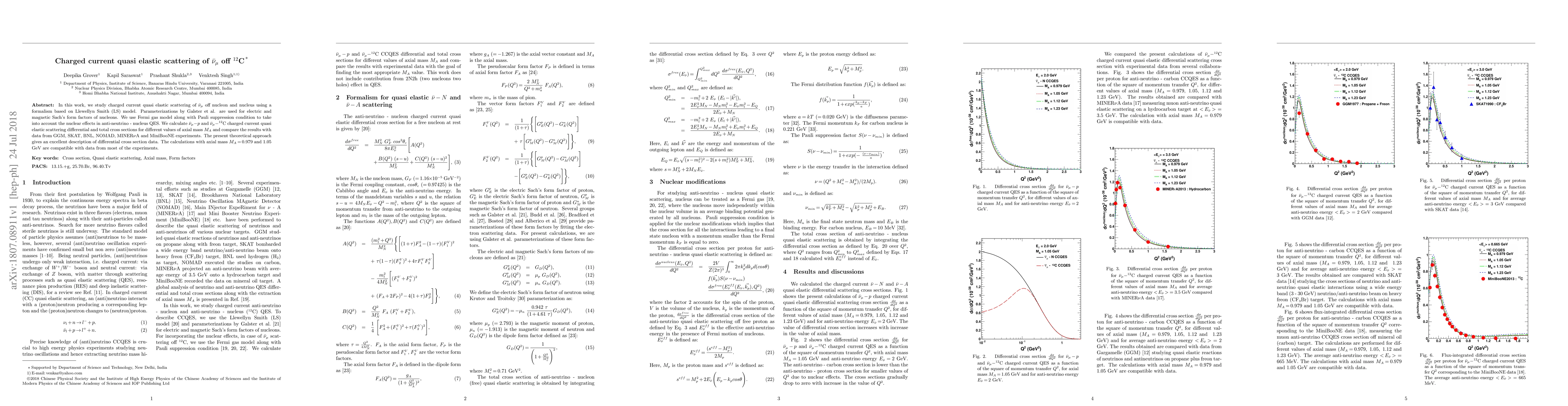 This paper investigates charged current quasi-elastic scattering of muon anti-neutrinos off nucleons and carbon-12 nuclei using the Llewellyn Smith model and Fermi gas model for nuclear effects. The study finds good agreement with experimental data for axial mass values of 0.979 and 1.05 GeV.