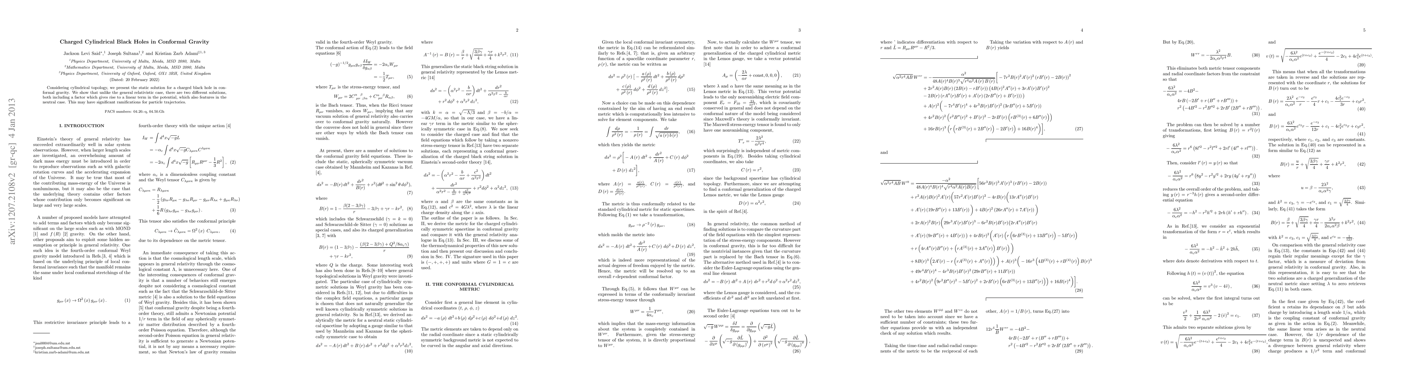 This paper presents static solutions for charged cylindrical black holes in conformal gravity, revealing two distinct solutions differing from the general relativistic case, with implications for particle trajectories due to a unique linear potential term.
