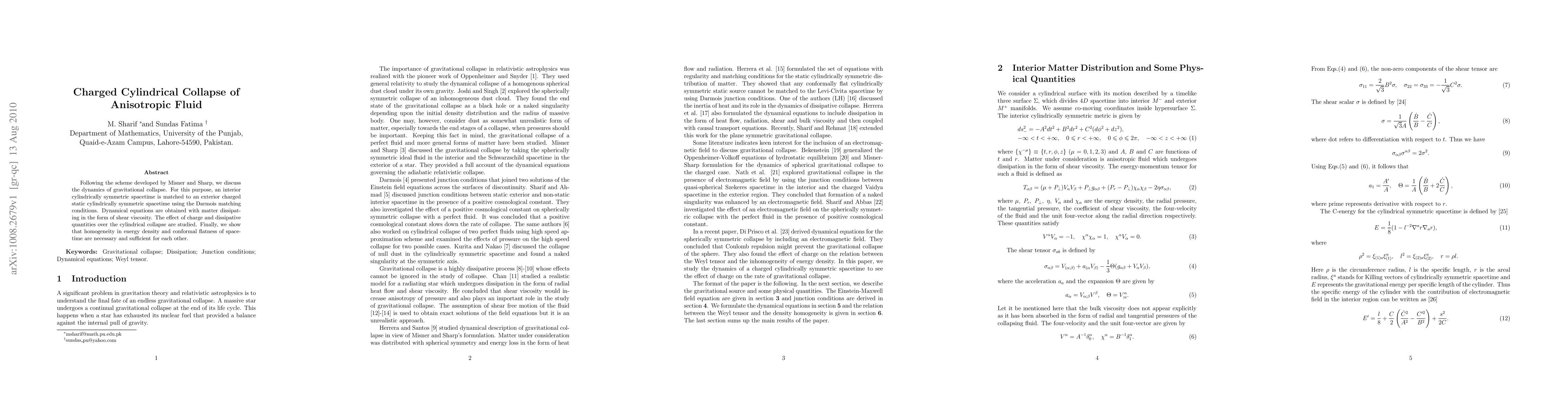 This paper investigates the gravitational collapse dynamics of an anisotropic fluid in a cylindrically symmetric spacetime, matching interior and exterior charged regions using Darmois conditions. It examines the influence of charge and shear viscosity on the collapse process and concludes that homogeneity in energy density and conformal flatness of spacetime are mutually dependent.