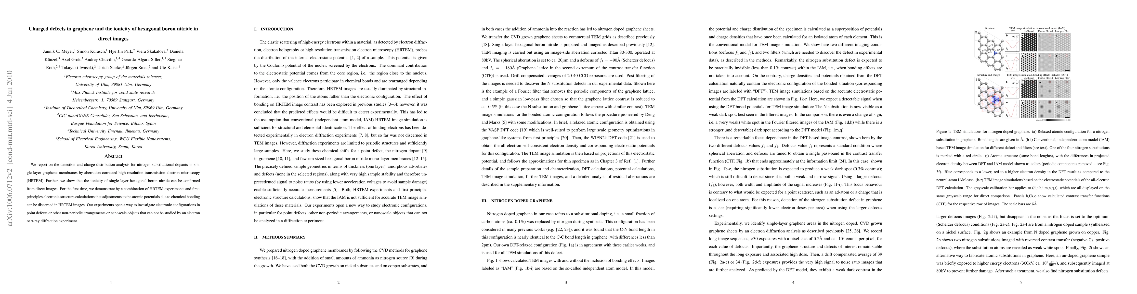 This paper reports on the detection of nitrogen dopants in graphene using high-resolution transmission electron microscopy and confirms the ionicity of hexagonal boron nitride from direct images. It demonstrates that atomic potential adjustments due to chemical bonding can be discerned in HRTEM images, providing a method to analyze electronic configurations in nanoscale defects.