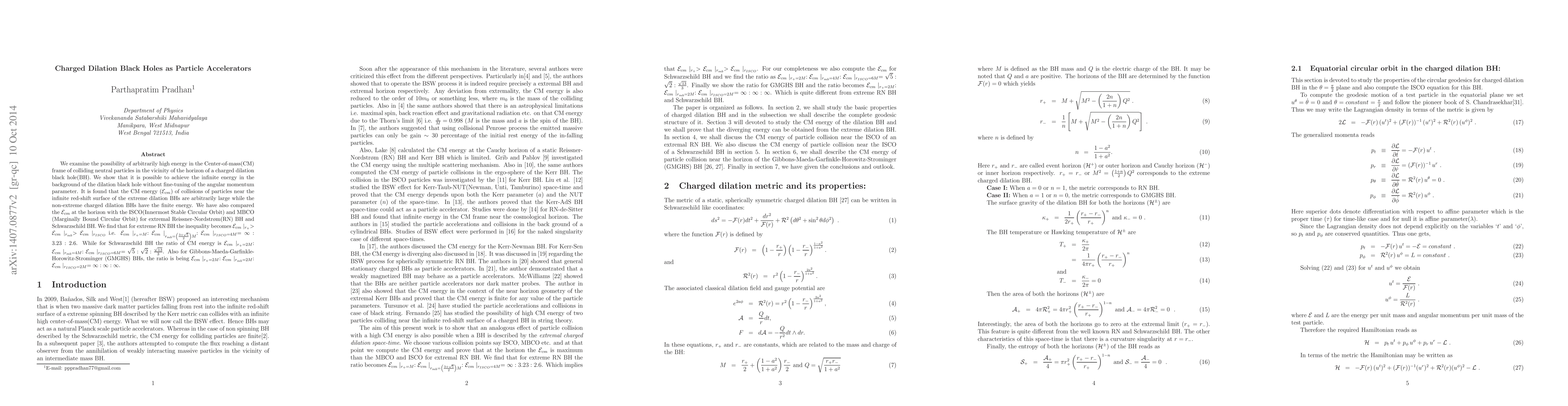 The paper presents a detailed analysis of CM energies in the context of charged dilation black holes, highlighting the divergence at the extremal limit and comparing it with other types of black holes.