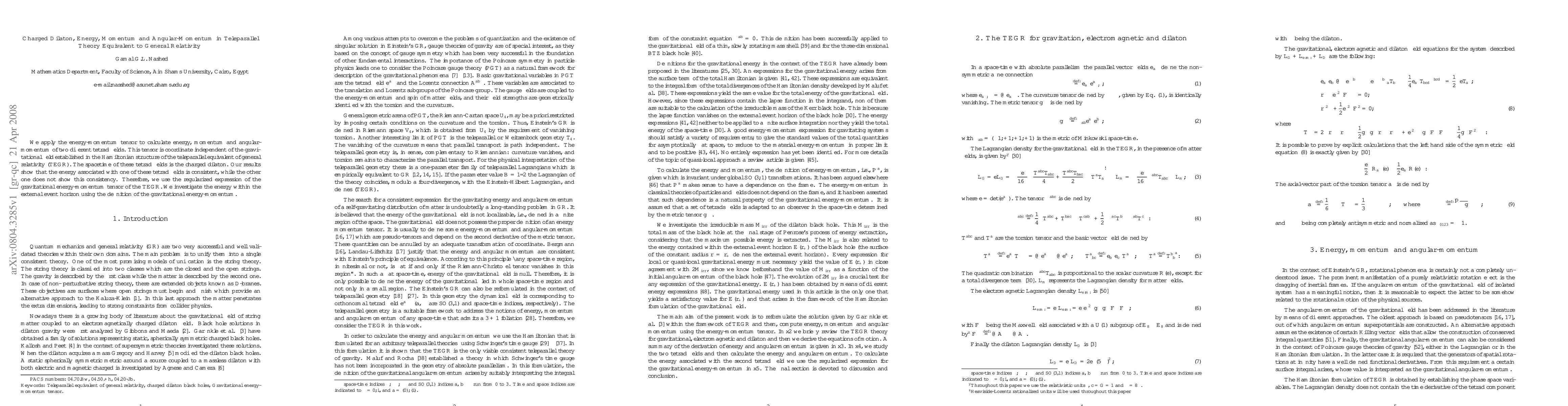 We apply the energy-momentum tensor to calculate energy, momentum and angular-momentum of two different tetrad fields. This tensor is coordinate independent of the gravitational field established in the Hamiltonian structure of the teleparallel equivalent of general relativity (TEGR). The spacetime of these tetrad fields is the charged dilaton. Our results show that the energy associated with one of these tetrad fields is consistent, while the other one does not show this consistency. Therefore, we use the regularized expression of the gravitational energy-momentum tensor of the TEGR. We investigate the energy within the external event horizon using the definition of the gravitational energy-momentum.