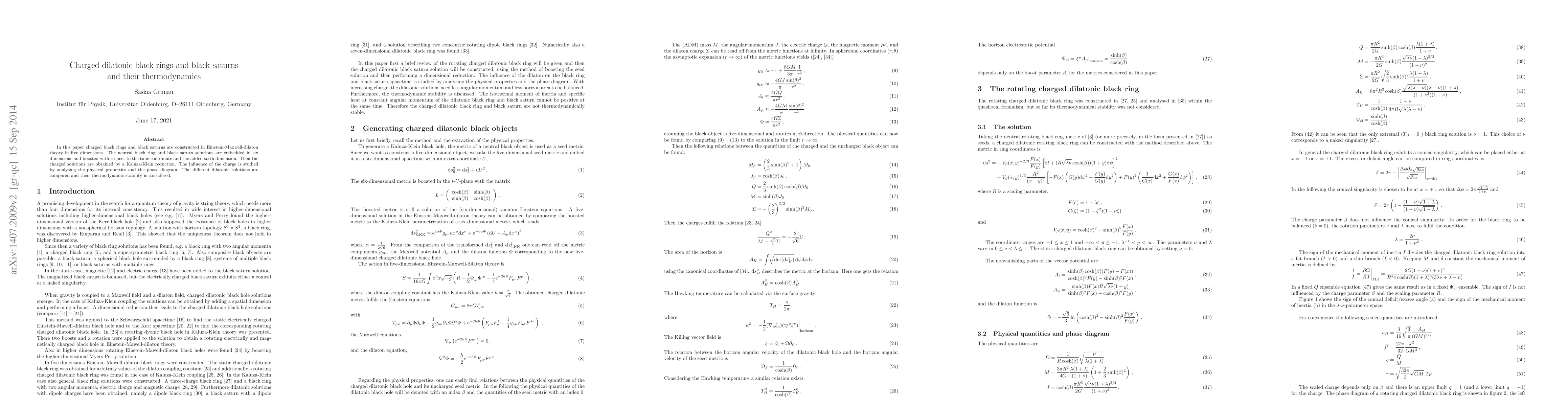In this article charged black rings and black saturns are constructed in Einstein-Maxwell-dilaton theory in five dimensions. The neutral black ring and black saturn solutions are embedded in six dimensions and boosted with respect to the time coordinate and the added sixth dimension. Then the charged solutions are obtained by a Kaluza-Klein reduction. The influence of the charge is studied by analysing the physical properties and the phase diagram. The different dilatonic solutions are compared and their thermodynamic stability is considered.