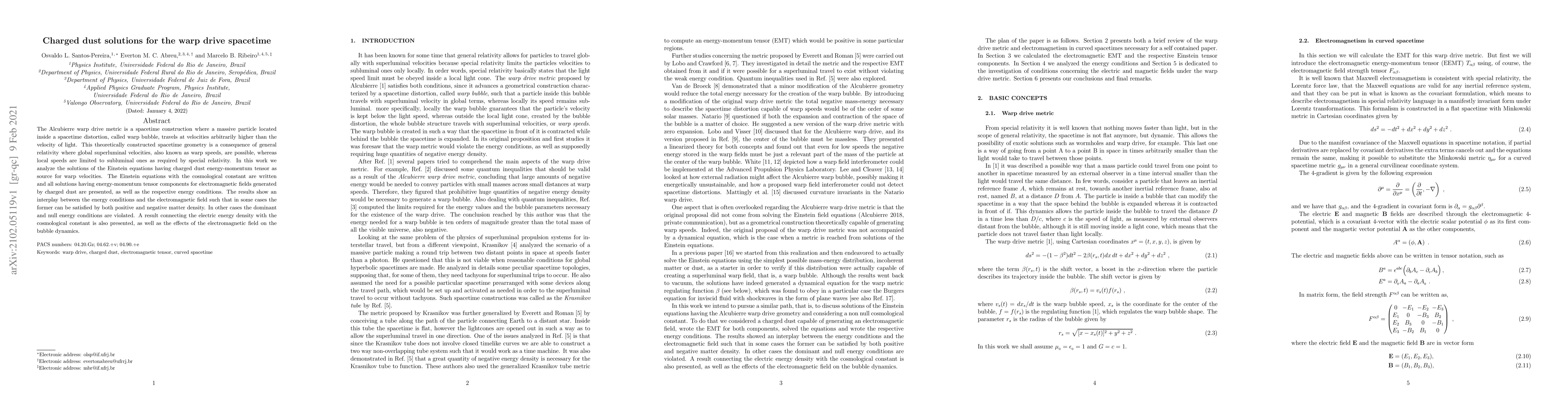 The Alcubierre warp drive metric is a spacetime construction where a massive particle located inside a spacetime distortion, called warp bubble, travels at velocities arbitrarily higher than the velocity of light. This theoretically constructed spacetime geometry is a consequence of general relativity where global superluminal velocities, also known as warp speeds, are possible, whereas local speeds are limited to subluminal ones as required by special relativity. In this work we analyze the solutions of the Einstein equations having charged dust energy-momentum tensor as source for warp velocities. The Einstein equations with the cosmological constant are written and all solutions having energy-momentum tensor components for electromagnetic fields generated by charged dust are presented, as well as the respective energy conditions. The results show an interplay between the energy conditions and the electromagnetic field such that in some cases the former can be satisfied by both positive and negative matter density. In other cases the dominant and null energy conditions are violated. A result connecting the electric energy density with the cosmological constant is also presented, as well as the effects of the electromagnetic field on the bubble dynamics.