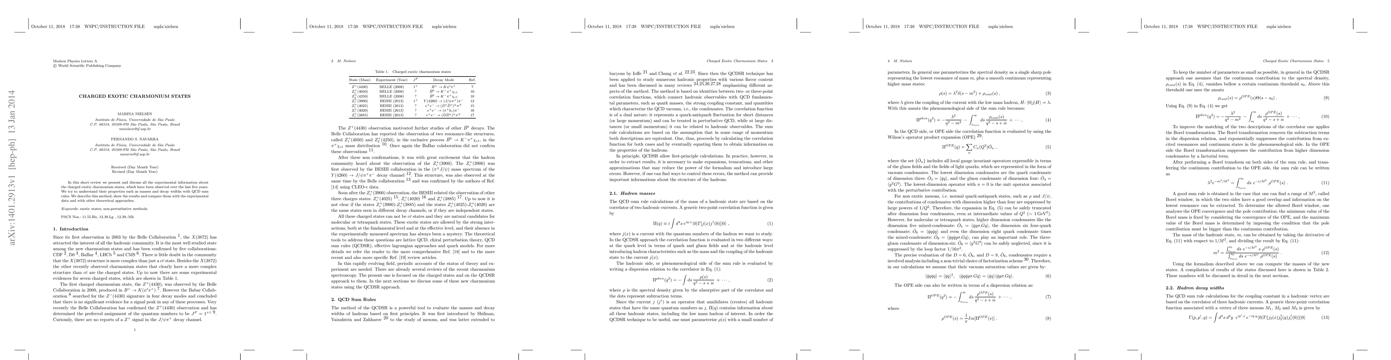 This paper reviews recent experimental findings on charged exotic charmonium states, analyzing their masses and decay widths using QCD sum rules, and compares these results with experimental data and other theoretical models.