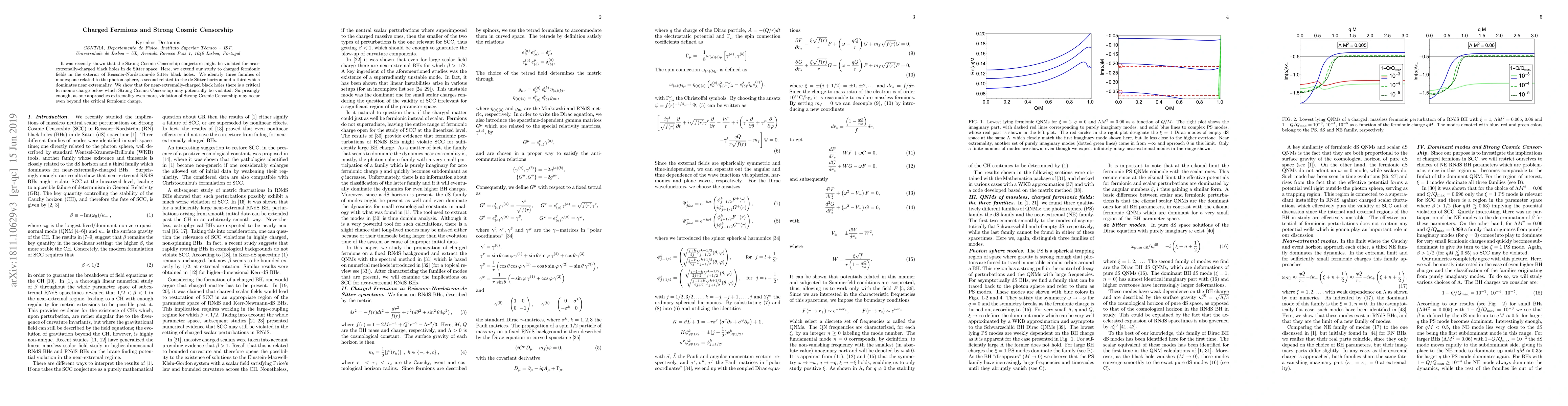 It was recently shown that the Strong Cosmic Censorship conjecture might be violated for near-extremally-charged black holes in de Sitter space. Here, we extend our study to charged fermionic fields in the exterior of Reissner-Nordstr\"{o}m-de Sitter black holes. We identify three families of modes; one related to the photon sphere, a second related to the de Sitter horizon and a third which dominates near extremality. We show that for near-extremally-charged black holes there is a critical fermionic charge below which Strong Cosmic Censorship may potentially be violated. Surprisingly enough, as one approaches extremality even more, violation of Strong Cosmic Censorship may occur even beyond the critical fermionic charge.