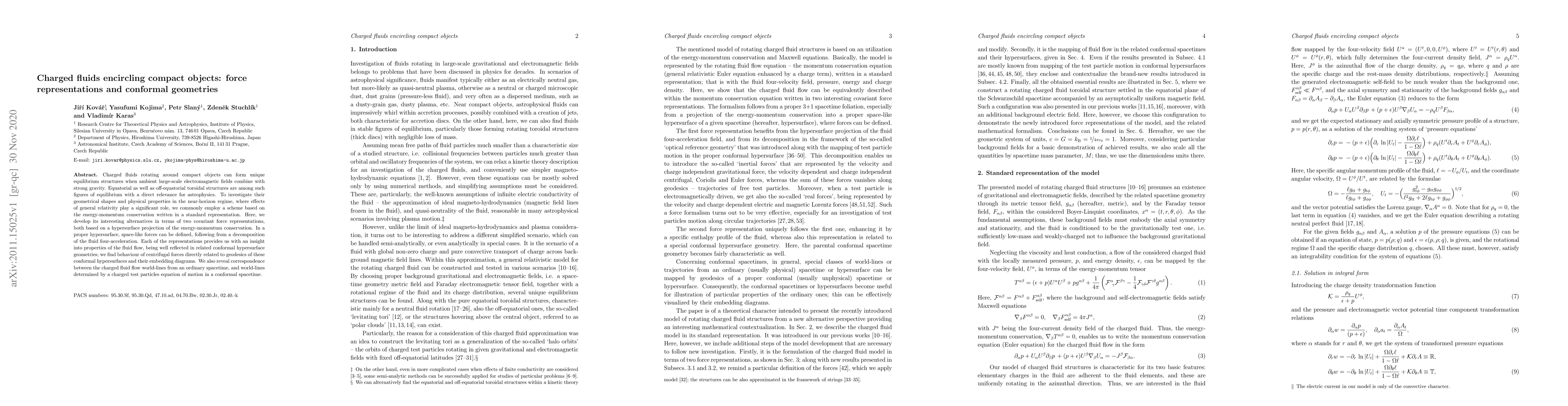 Charged fluids rotating around compact objects can form unique equilibrium structures when ambient large-scale electromagnetic fields combine with strong gravity. Equatorial as well as off-equatorial toroidal structures are among such figures of equilibrium with a direct relevance for astrophysics. To investigate their geometrical shapes and physical properties in the near-horizon regime, where effects of general relativity play a significant role, we commonly employ a scheme based on the energy-momentum conservation written in a standard representation. Here, we develop its interesting alternatives in terms of two covariant force representations, both based on a hypersurface projection of the energy-momentum conservation. In a proper hypersurface, space-like forces can be defined, following from a decomposition of the fluid four-acceleration. Each of the representations provides us with an insight into properties of the fluid flow, being well reflected in related conformal hypersurface geometries; we find behaviour of centrifugal forces directly related to geodesics of these conformal hypersurfaces and their embedding diagrams. We also reveal correspondence between the charged fluid flow world-lines from an ordinary spacetime, and world-lines determined by a charged test particles equation of motion in a conformal spacetime.