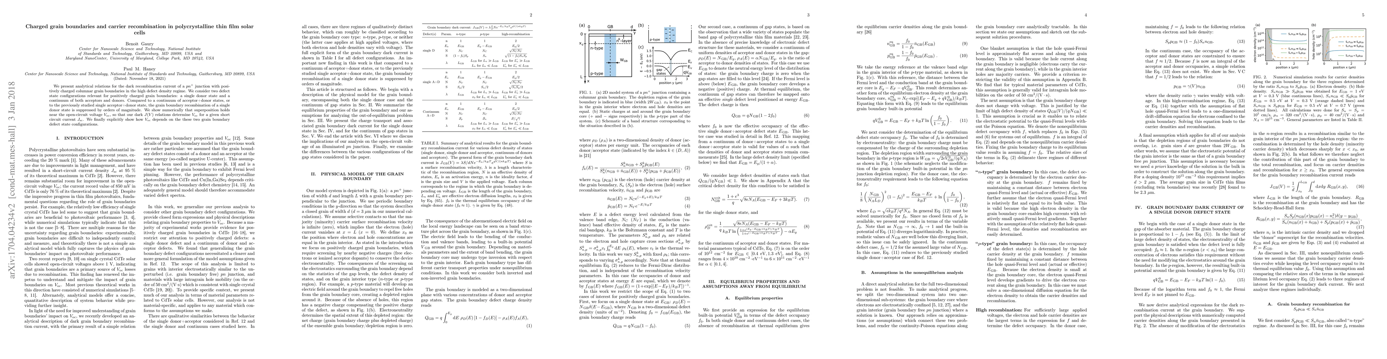 This paper develops analytical models for dark recombination current in polycrystalline thin film solar cells, focusing on the impact of positively charged columnar grain boundaries. It finds that a single donor state configuration significantly reduces grain boundary recombination compared to other configurations, and numerically demonstrates how these models influence the open-circuit voltage.