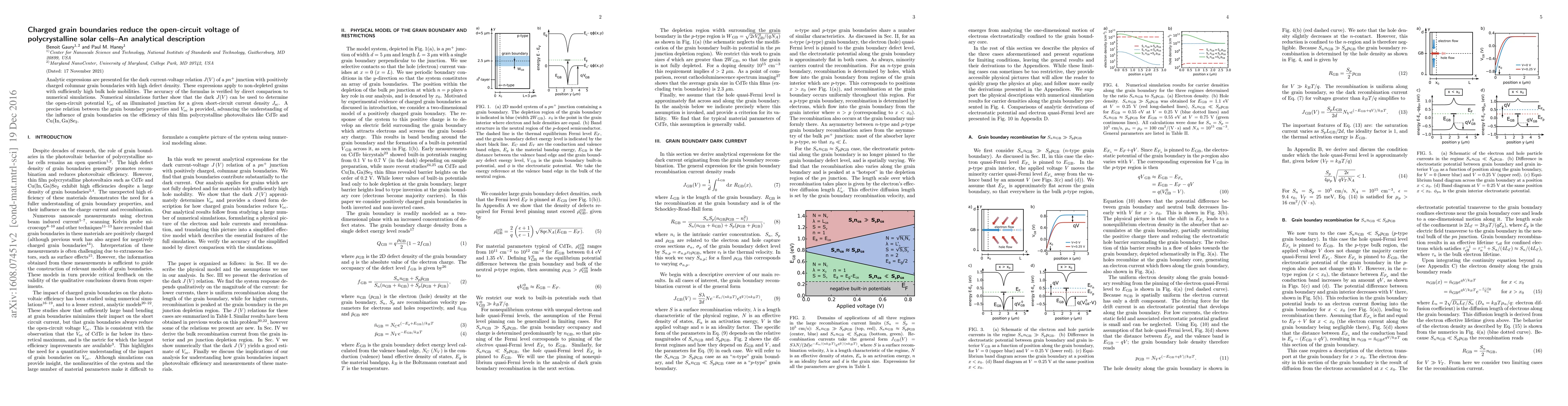 This paper presents analytical expressions for the dark current-voltage relation in polycrystalline solar cells with positively charged grain boundaries, showing how these boundaries reduce the open circuit voltage. The study provides a precise relation between grain boundary properties and open circuit voltage, enhancing the understanding of efficiency in thin film photovoltaics.