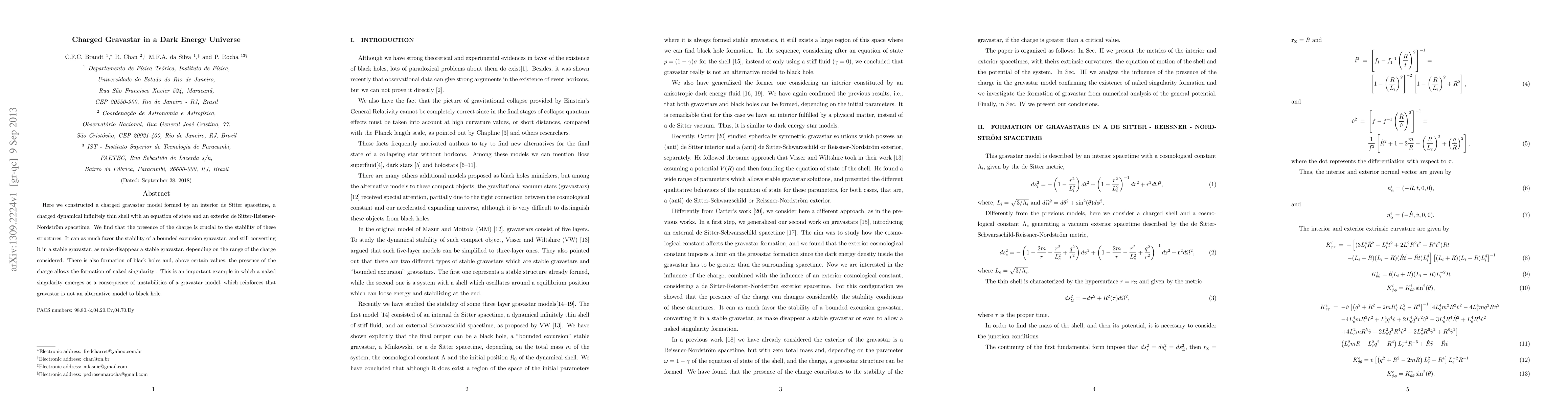 This paper constructs a charged gravastar model with an interior de Sitter spacetime and a charged thin shell, showing that charge is crucial for the stability of these structures. The presence of charge can either stabilize or destabilize gravastars, and can lead to the formation of naked singularities, indicating gravastars are not a black hole alternative.