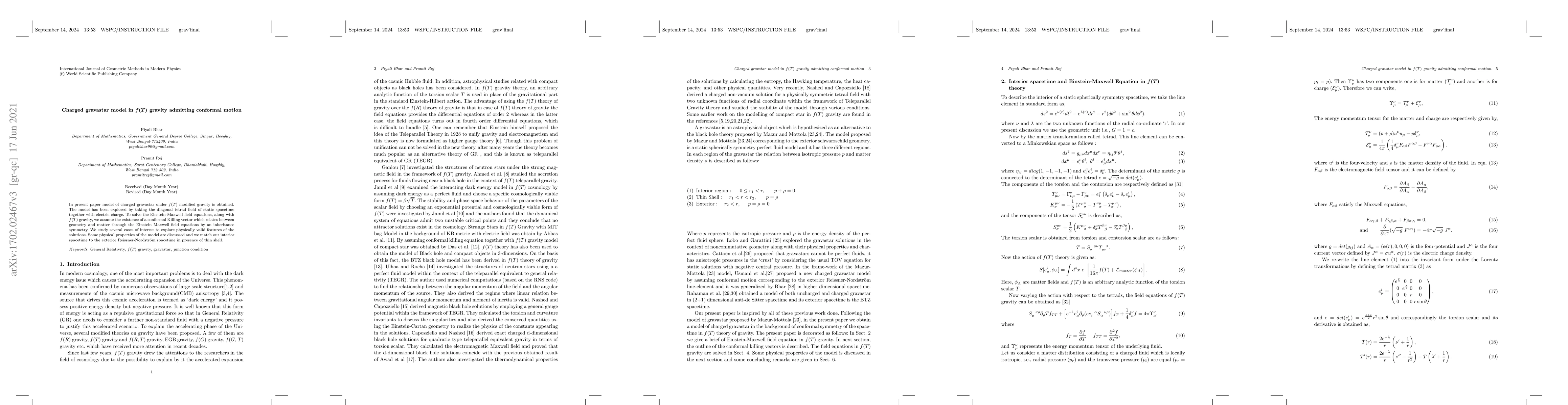 In this paper, model of charged gravastar under $f(T)$ modified gravity is obtained. The model has been explored by taking the diagonal tetrad field of static spacetime together with electric charge. To solve the Einstein-Maxwell field equations, along with $f(T)$ gravity, we assume the existence of a conformal Killing vector which relates between geometry and matter through the Einstein-Maxwell field equations by an inheritance symmetry. We study several cases of interest to explore physically valid features of the solutions. Some physical properties of the model are discussed and we match our interior spacetime to the exterior Reissner-Nordstr\"{o}m spacetime in presence of thin shell.