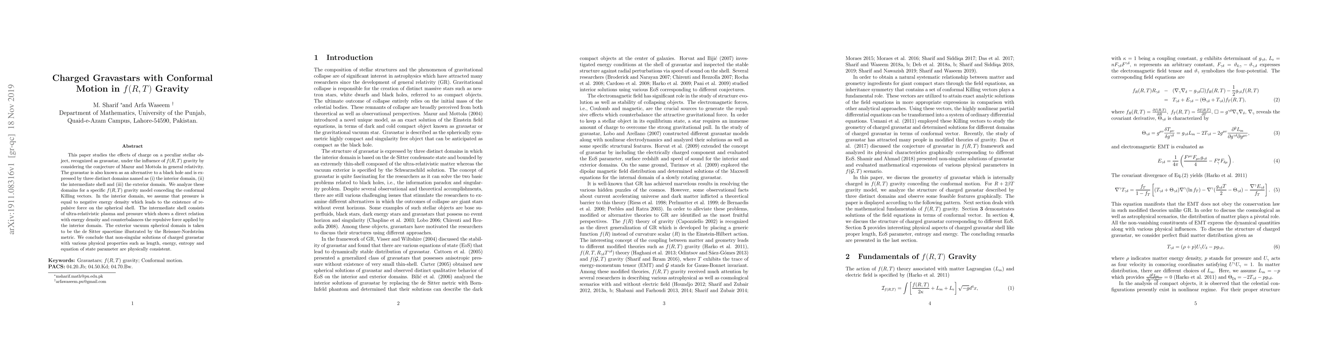 This paper studies the effects of charge on a peculiar stellar object, recognized as gravastar, under the influence of $f(R,T)$ gravity by considering the conjecture of Mazur and Mottola in general relativity. The gravastar is also known as an alternative to a black hole and is expressed by three distinct domains named as (i) the interior domain, (ii) the intermediate shell and (iii) the exterior domain. We analyze these domains for a specific $f(R,T)$ gravity model conceding the conformal Killing vectors. In the interior domain, we assume that pressure is equal to negative energy density which leads to the existence of repulsive force on the spherical shell. The intermediate shell consists of ultra-relativistic plasma and pressure which shows a direct relation with energy density and counterbalances the repulsive force applied by the interior domain. The exterior vacuum spherical domain is taken to be the de Sitter spacetime illustrated by the Reissner-Nordstr\"{o}m metric. We conclude that non-singular solutions of charged gravastar with various physical properties such as length, energy, entropy and equation of state parameter are physically consistent.