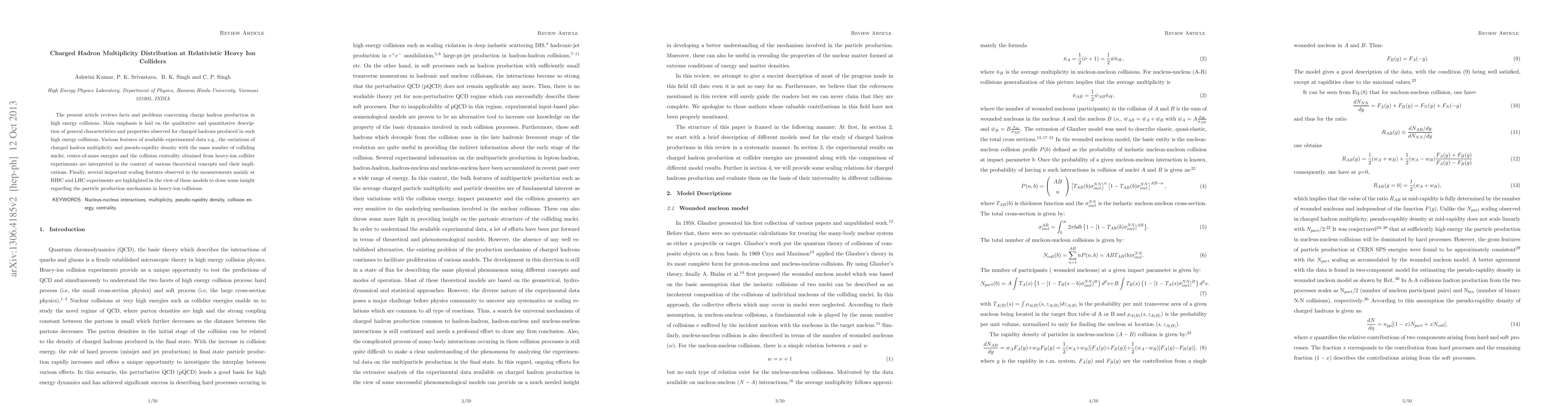 The present article reviews facts and problems concerning charge hadron production in high energy collisions. Main emphasis is laid on the qualitative and quantitative description of general characteristics and properties observed for charged hadrons produced in such high energy collisions. Various features of available experimental data e.g., the variations of charged hadron multiplicity and pseudo-rapidity density with the mass number of colliding nuclei, center-of-mass energies and the collision centrality obtained from heavy-ion collider experiments are interpreted in the context of various theoretical concepts and their implications. Finally, several important scaling features observed in the measurements mainly at RHIC and LHC experiments are highlighted in the view of these models to draw some insight regarding the particle production mechanism in heavy-ion collisions.