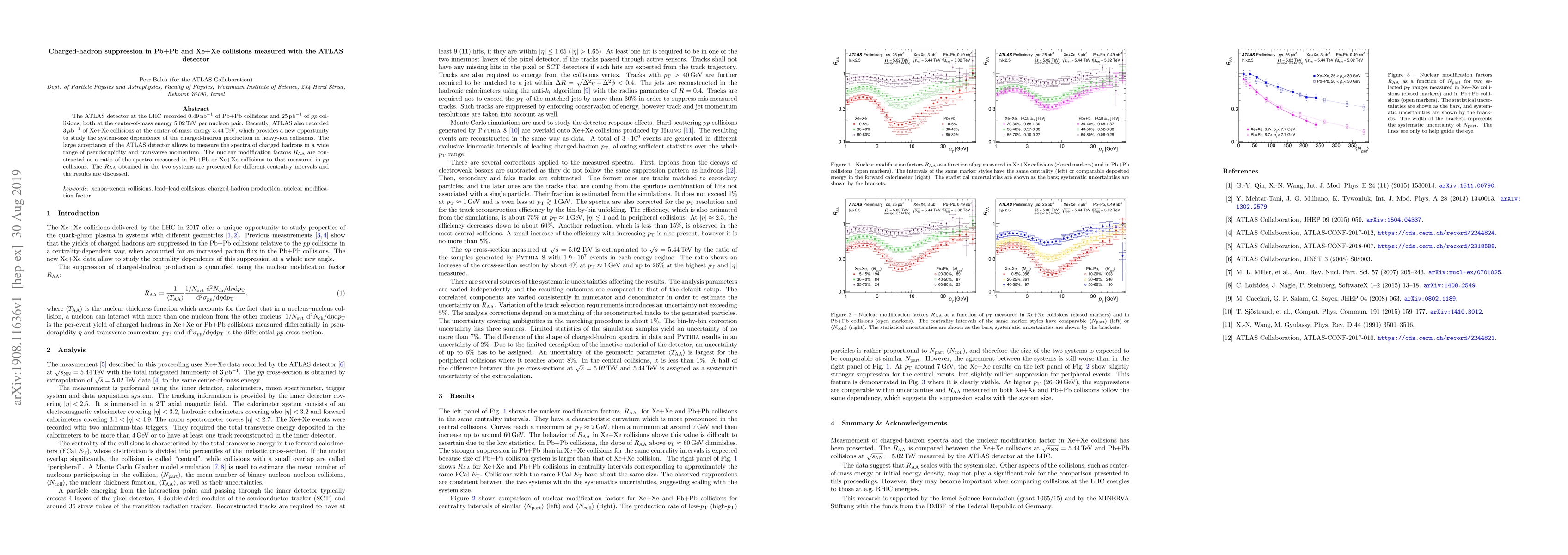 The ATLAS detector measured charged-hadron suppression in Pb+Pb and Xe+Xe collisions at the LHC, comparing spectra to pp collisions to determine nuclear modification factors $R_\mathrm{AA}$. The results show system-size dependence in charged-hadron production across different centrality intervals.