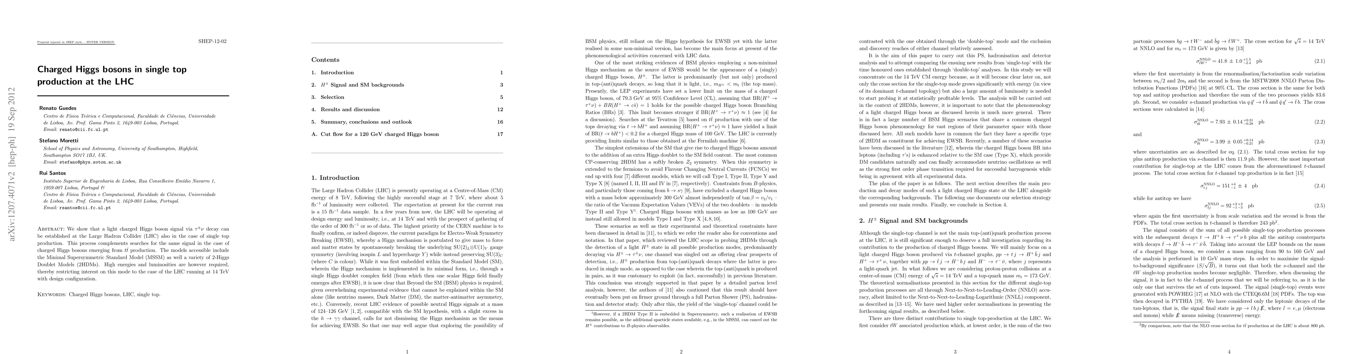 The paper demonstrates that a light charged Higgs boson signal, specifically via $\tau^\pm\nu$ decay, can be detected at the LHC in single top production processes, complementing similar searches from $t \bar t$ production. This method applies to MSSM and various 2HDM models, though requires high energies and luminosities, feasible only with the LHC operating at 14 TeV.