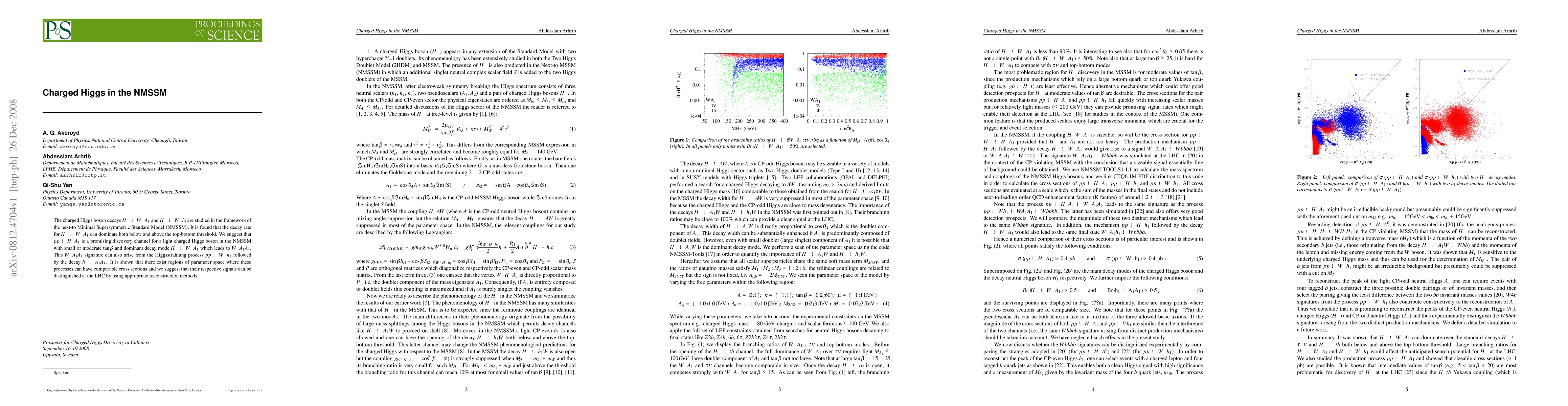 The charged Higgs boson decays $H^\pm\to W^\pm A_1$ and $H^\pm\to W^\pm h_i$ are studied in the framework of the next-to Minimal Supersymmetric Standard Model (NMSSM). It is found that the decay rate for H^\pm\to W^\pm A_1 can dominate both below and above the top-bottom threshold. We suggest that p p\to H^\pm A_1 is a promising discovery channel for a light charged Higgs boson in the NMSSM with small or moderate \tan\beta and dominant decay mode H^\pm \to W^\pm A_1 which leads to W^\pm A_1 A_1. This W^\pm A_1 A_1 signature can also arise from the Higgsstrahlung process pp\to W^\pm h_1 followed by the decay h_1\to A_1 A_1. It is shown that there exist regions of parameter space where these processes can have comparable cross sections and we suggest that their respective signals can be distinguished at the LHC by using appropriate reconstruction methods.