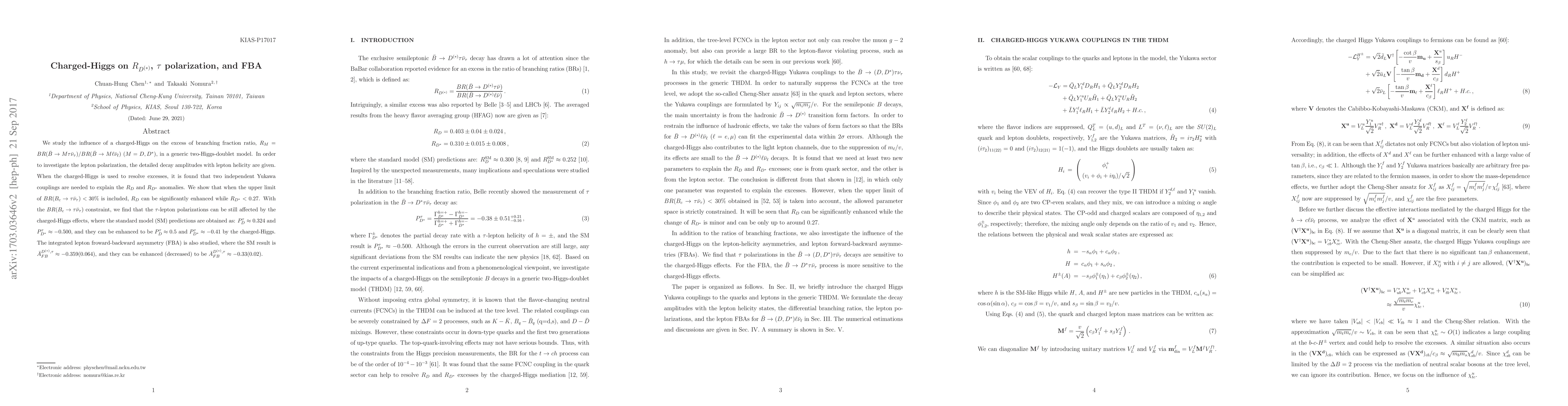 We study the influence of a charged-Higgs on the excess of branching fraction ratio, $R_M = BR(\bar B \to M \tau \bar\nu_\tau)/BR(\bar B \to M \ell \bar \nu_\ell)$ $(M=D, D^*)$, in a generic two-Higgs-doublet model. In order to investigate the lepton polarization, the detailed decay amplitudes with lepton helicity are given. When the charged-Higgs is used to resolve excesses, it is found that two independent Yukawa couplings are needed to explain the $R_D$ and $R_{D^*}$ anomalies. We show that when the upper limit of $BR(B_c \to \tau \bar \nu_\tau)<30\%$ is included, $R_D$ can be significantly enhanced while $R_{D^*}<0.27$. With the $BR(B_c\to \tau \bar \nu_\tau)$ constraint, we find that the $\tau$-lepton polarizations can be still affected by the charged-Higgs effects, where the standard model (SM) predictions are obtained as: $P^\tau_{D} \approx 0.324$ and $P^\tau_{D^*}\approx -0.500$, and they can be enhanced to be $P^\tau_{D} \approx 0.5$ and $P^\tau_{D^*} \approx -0.41$ by the charged-Higgs. The integrated lepton froward-backward asymmetry (FBA) is also studied, where the SM result is $\bar A^{D^{(*)},\tau}_{FB} \approx -0.359(0.064)$, and they can be enhanced (decreased) to be $\bar A^{D^{(*)},\tau}_{FB} \approx -0.33 (0.02)$.