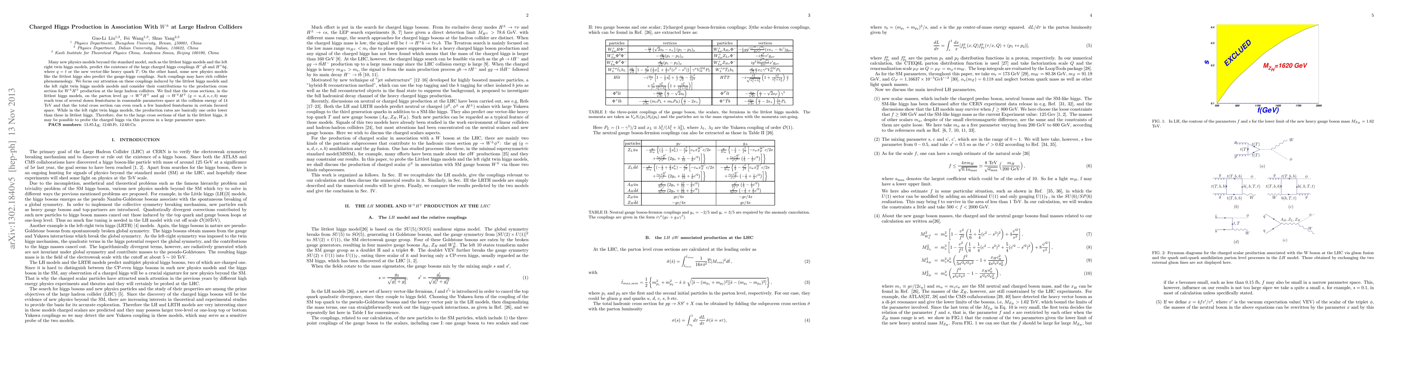 This paper explores charged Higgs production in association with W bosons at the Large Hadron Collider, focusing on models beyond the Standard Model like the littlest higgs and left-right twin higgs. It finds that the littlest higgs model can produce W±H∓ pairs with cross sections reaching hundreds of femtobarns at 14 TeV, making it feasible to probe charged Higgs in this parameter space.
