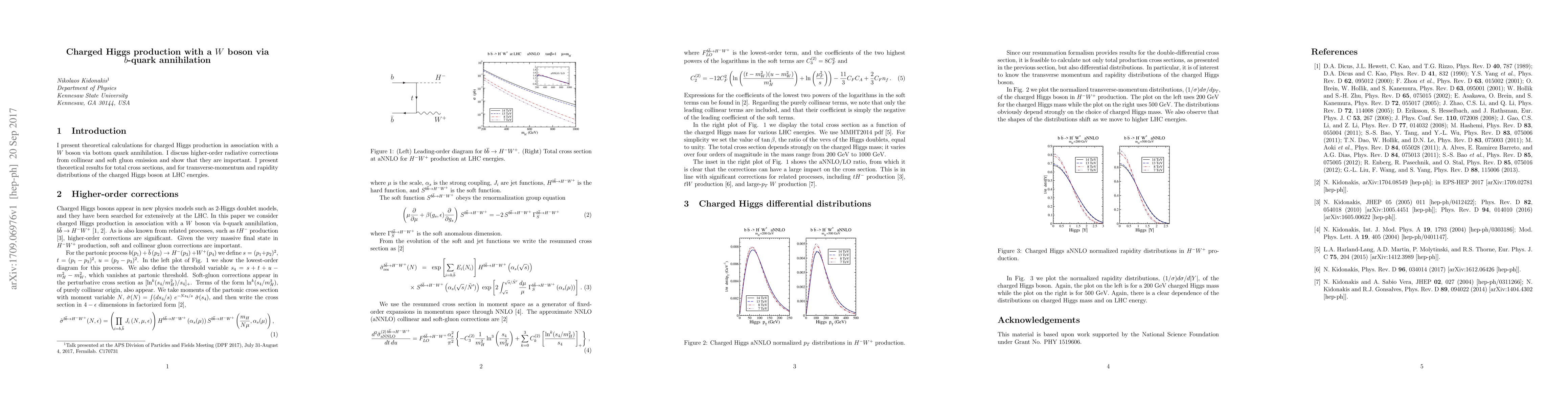 I present theoretical calculations for charged Higgs production in association with a $W$ boson via bottom quark annihilation. I discuss higher-order radiative corrections from collinear and soft gluon emission and show that they are important. I present theoretical results for total cross sections, and for transverse-momentum and rapidity distributions of the charged Higgs boson at LHC energies.
