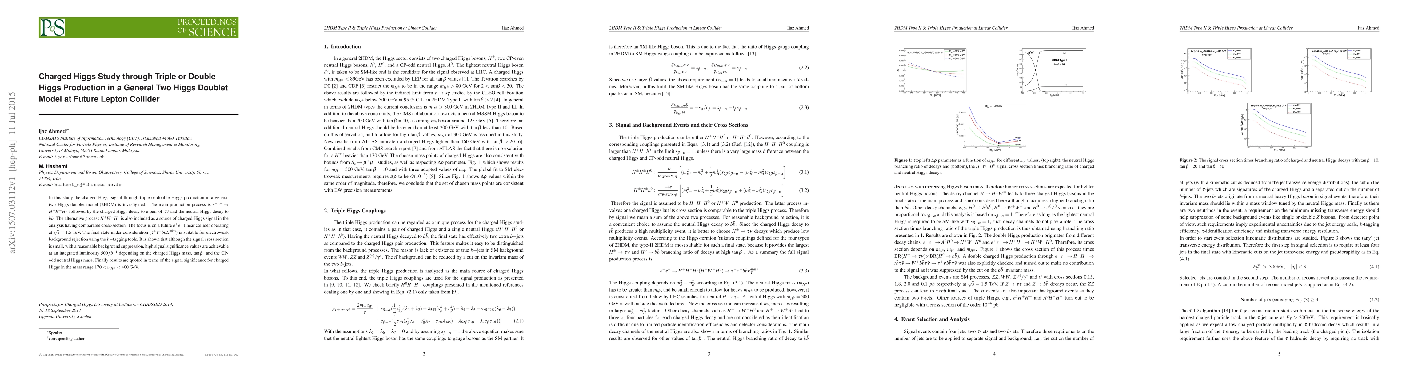 main production process is $e^+e^- \rightarrow H^+H^-H^0$ followed by the