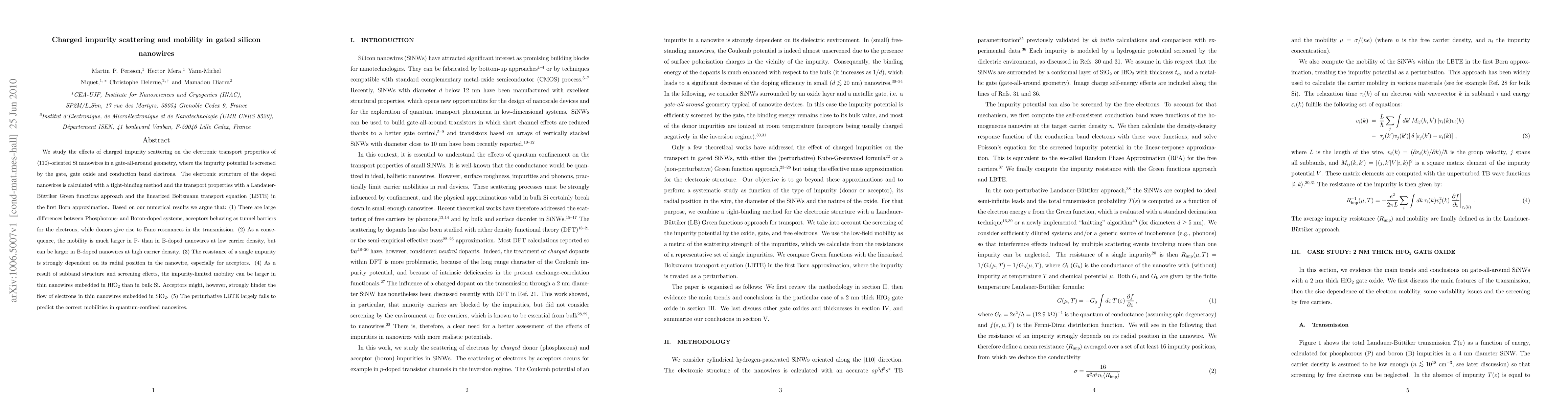 This paper investigates charged impurity scattering's impact on electronic transport in gate-all-around silicon nanowires, revealing significant differences in mobility between P and B doping due to distinct scattering mechanisms. The study finds that P doping leads to higher mobility at low carrier densities, while B doping may outperform at high densities, and the radial position of impurities greatly affects resistance, especially for acceptors.