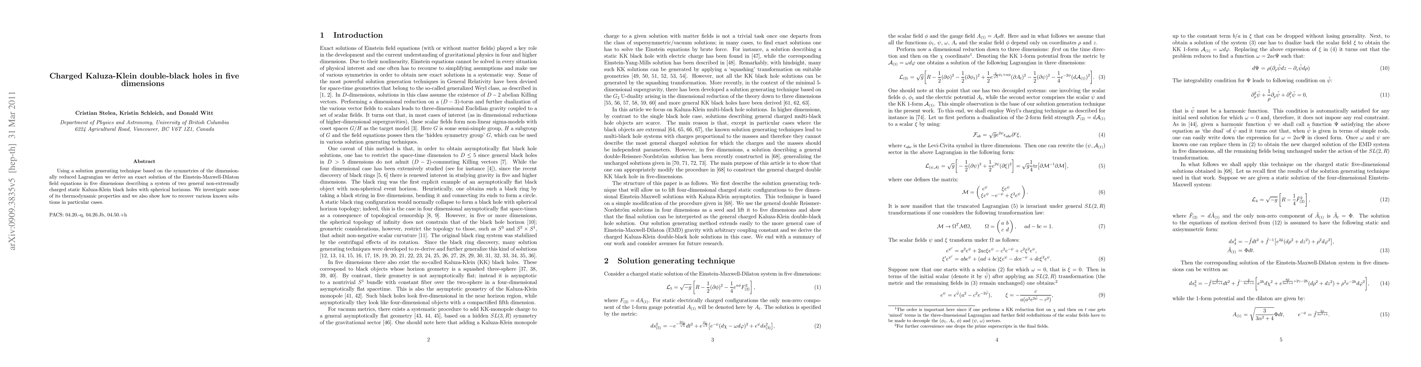 This paper presents an exact solution for two charged Kaluza-Klein double-black holes in five dimensions, derived using a symmetry-based technique. It explores thermodynamic properties and demonstrates the recovery of known solutions in specific scenarios.