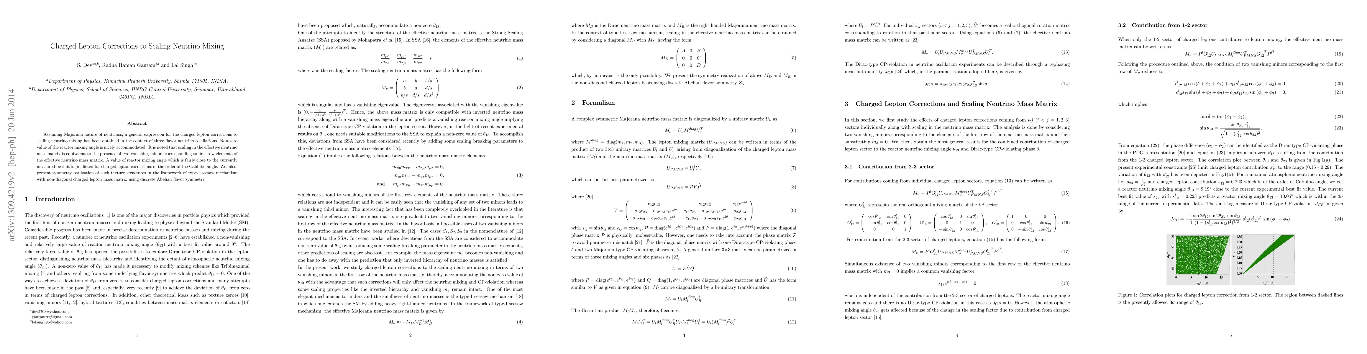 This paper derives a general expression for charged lepton corrections to scaling neutrino mixing in the context of three-flavor neutrino oscillations, accommodating a non-zero reactor mixing angle. It predicts a reactor mixing angle close to the best fit measurement, and presents a symmetry realization of these structures using the type-I seesaw mechanism with discrete Abelian flavor symmetry.