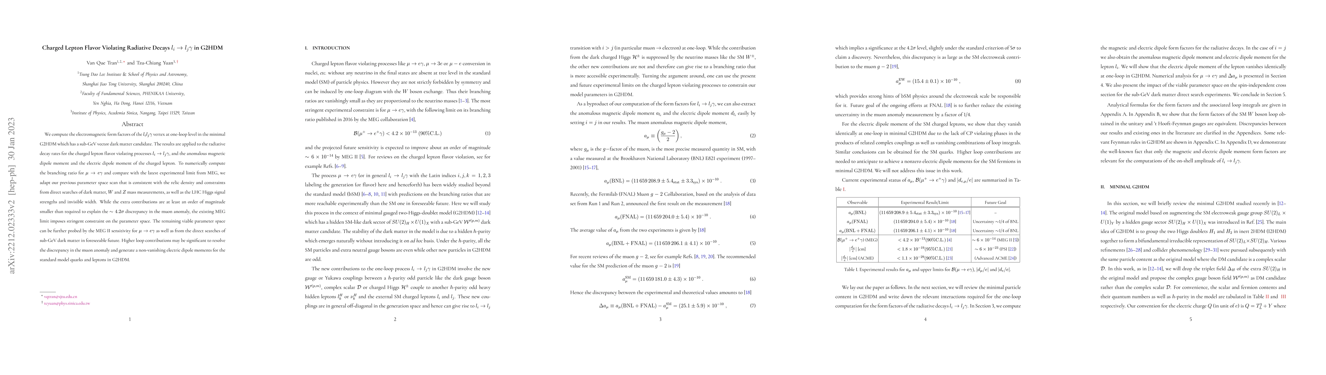 We compute the electromagnetic form factors of the $l_i l_j \gamma$ vertex at one-loop level in the minimal G2HDM which has a sub-GeV vector dark matter candidate. The results are applied to the radiative decay rates for the charged lepton flavor violating processes $l_i \to l_j \gamma$, and the anomalous magnetic dipole moment and the electric dipole moment of the charged lepton. To numerically compute the branching ratio for $\mu \to e \gamma$ and compare with the latest experimental limit from MEG, we adapt our previous parameter space scan that is consistent with the relic density and constraints from direct searches of dark matter, $W$ and $Z$ mass measurements, as well as the LHC Higgs signal strengths and invisible width. While the extra contributions are at least an order of magnitude smaller than required to explain the $\sim 4.2 \sigma$ discrepancy in the muon anomaly, the existing MEG limit imposes stringent constraint on the parameter space. The remaining viable parameter space can be further probed by the MEG II sensitivity for $\mu \to e \gamma$ as well as from the direct searches of sub-GeV dark matter in foreseeable future. Higher loop contributions may be significant to resolve the discrepancy in the muon anomaly and generate a non-vanishing electric dipole moments for the standard model quarks and leptons in G2HDM.