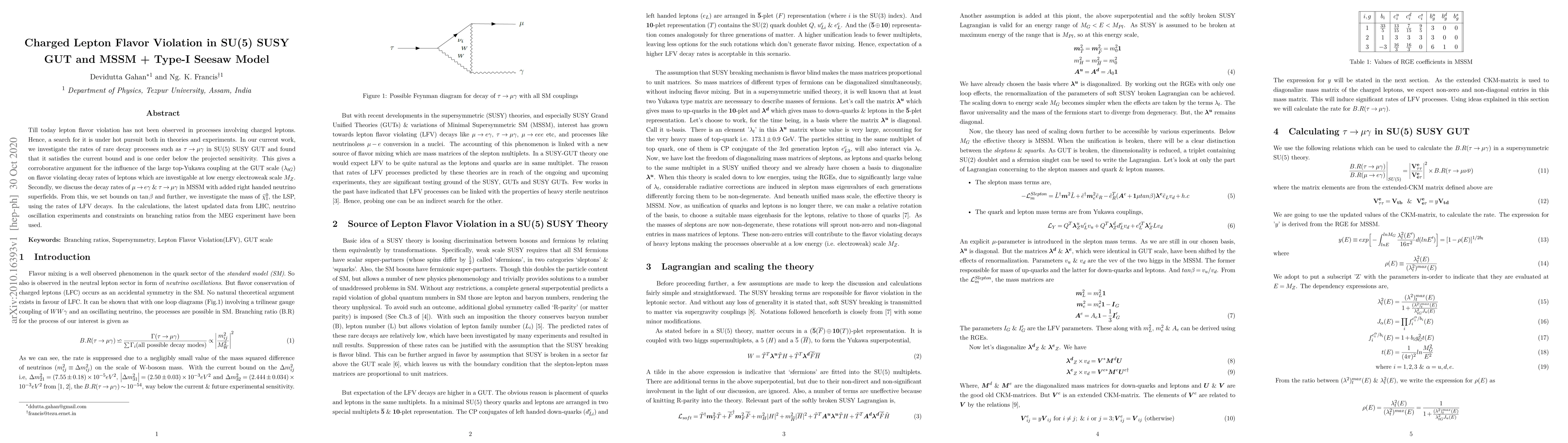 This paper investigates charged lepton flavor violation (LFV) in SU(5) SUSY GUT and MSSM + Type-I seesaw models, finding that $\tau \rightarrow \mu \gamma$ decay rates in SU(5) SUSY GUT are within the current experimental bounds. It also sets bounds on $\tan \beta$ and the LSP mass in MSSM using updated LHC and MEG data.