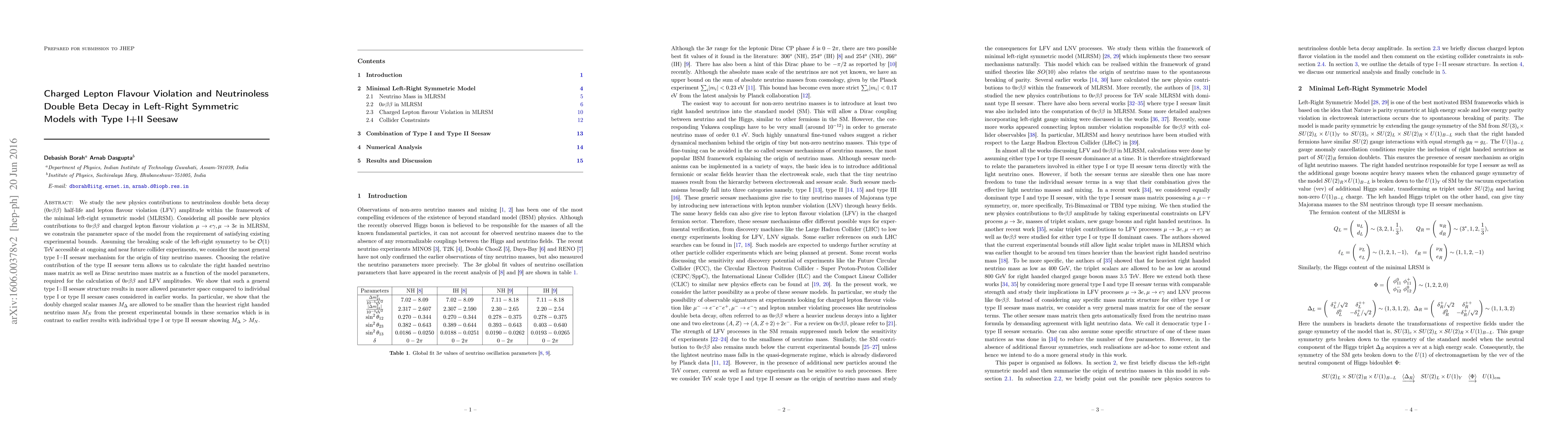 This paper investigates new physics contributions to neutrinoless double beta decay and charged lepton flavour violation in the context of minimal left-right symmetric models with type I+II seesaw mechanisms. It finds that the combined type I+II seesaw structure allows for a broader parameter space and permits doubly charged scalar masses to be smaller than the heaviest right-handed neutrino mass, contrary to previous results with individual type I or type II seesaw.