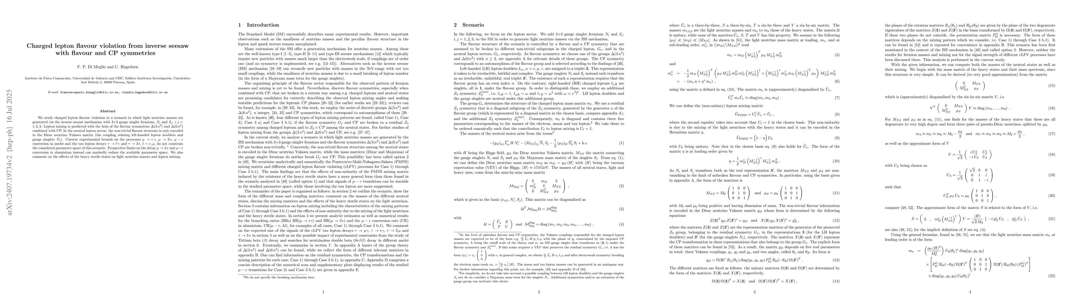 We study charged lepton flavour violation in a scenario in which light neutrino masses are generated via the inverse seesaw mechanism with 3+3 gauge singlet fermions, Ni and Sj, i,j=1,2,3. Lepton mixing is predicted with the help of the flavour symmetries Delta (3 n^2) and Delta (6 n^2) combined with CP. In the neutral lepton sector, the non-trivial flavour structure is only encoded in the Dirac neutrino Yukawa matrix (the coupling relating left-handed lepton doublets and gauge singlets Ni). Current experimental bounds on the processes mu -> e gamma, mu -> 3 e, mu-e conversion in nuclei and the tau lepton decays tau -> l gamma and tau -> 3 l, l=e, mu, do not constrain the considered parameter space of this scenario. Prospective limits on the decay mu -> 3 e and mu-e conversion in aluminium instead can markedly reduce the available parameter space. We also comment on the effects of the heavy sterile states on light neutrino masses and lepton mixing.