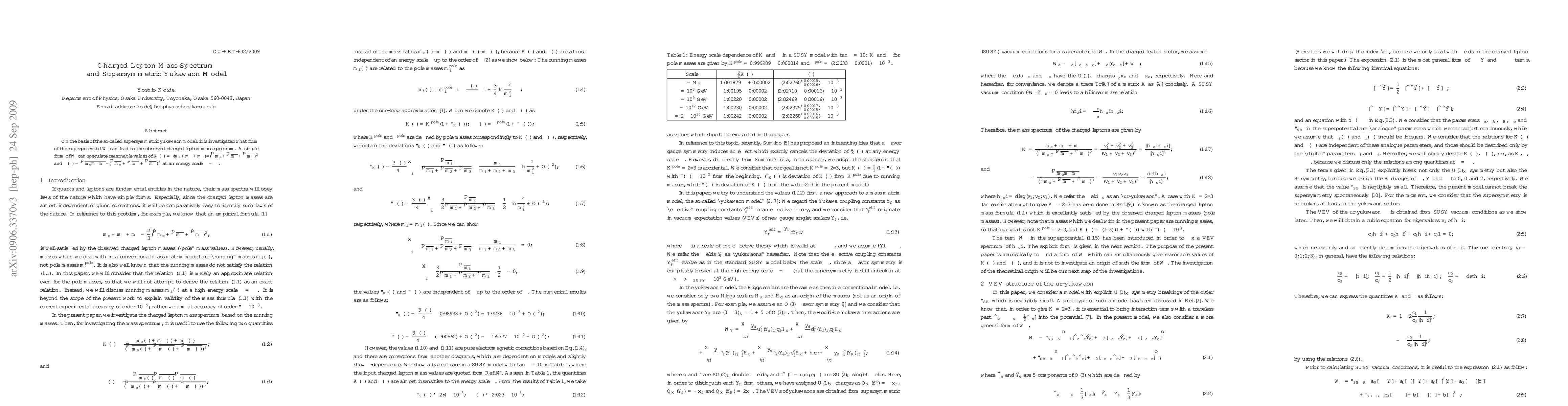 On the basis of the so-called supersymmetric yukawaon model, it is investigated what form of the superpotential W can lead to the observed charged lepton mass spectrum. A simple form of W can speculate reasonable values of K(\mu)=(m_e +m_\mu + m_\tau)/(\sqrt{m_e} + \sqrt{m_\mu} + \sqrt{m_\tau})^2 and \kappa(\mu)=\sqrt{m_e m_\mu m_\tau}/ (\sqrt{m_e} + \sqrt{m_\mu}+ \sqrt{m_\tau})^3 at an energy scale \mu=\Lambda.
