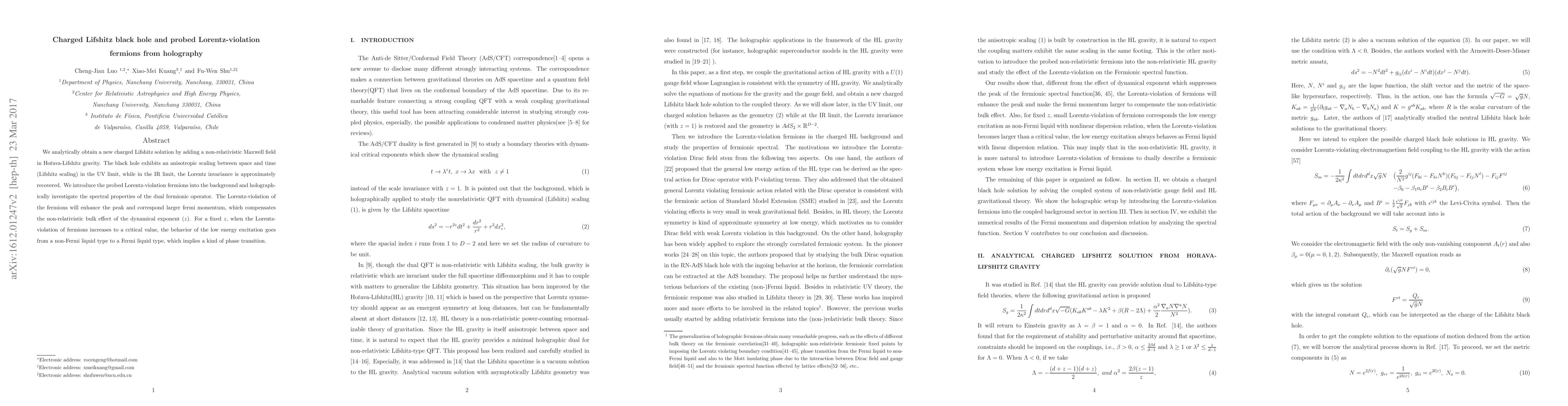 We analytically obtain a new charged Lifshtitz solution by adding a non-relativistic Maxwell field in Horava-Lifshitz gravity. The black hole exhibits an anisotropic scaling between space and time (Lifshitz scaling) in the UV limit, while in the IR limit, the Lorentz invariance is recovered. We introduce the probed Lorentz-violation fermions into the background and holographically investigate the spectral properties of the dual fermionic operator. The Lorentz-violation of fermions will enhance the peak and corresponds larger fermi momentum, which compensates the non-relativistic bulk effect of the dynamical exponent. For a fixed $z$, when the Lorentz-violation of fermions increases to a critical value, the behavior of the low energy excitation goes from a non-Fermi liquid type to a fermi liquid type, which implies a kind of phase transition.