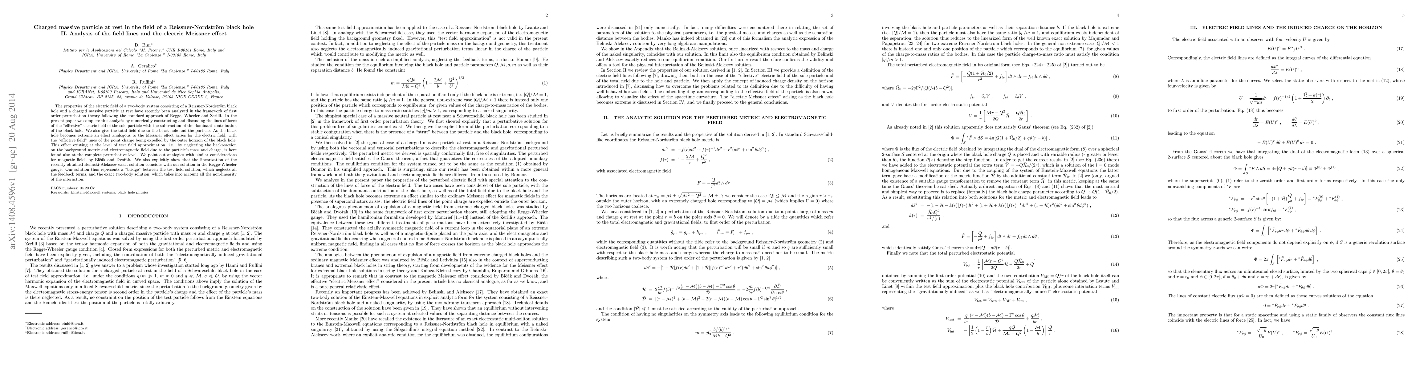 The properties of the electric field of a two-body system consisting of a Reissner-Nordstr\"om black hole and a charged massive particle at rest have recently been analyzed in the framework of first order perturbation theory following the standard approach of Regge, Wheeler and Zerilli. In the present paper we complete this analysis by numerically constructing and discussing the lines of force of the "effective" electric field of the sole particle with the subtraction of the dominant contribution of the black hole. We also give the total field due to the black hole and the particle. As the black hole becomes extreme an effect analogous to the Meissner effect arises for the electric field, with the "effective field" lines of the point charge being expelled by the outer horizon of the black hole. This effect existing at the level of test field approximation, i.e. by neglecting the backreaction on the background metric and electromagnetic field due to the particle's mass and charge, is here found also at the complete perturbative level. We point out analogies with similar considerations for magnetic fields by Bi{\v c}\'ak and Dvo{\v r}\'ak. We also explicitly show that the linearization of the recently obtained Belinski-Alekseev exact solution coincides with our solution in the Regge-Wheeler gauge. Our solution thus represents a "bridge" between the test field solution, which neglects all the feedback terms, and the exact two-body solution, which takes into account all the non-linearity of the interaction.