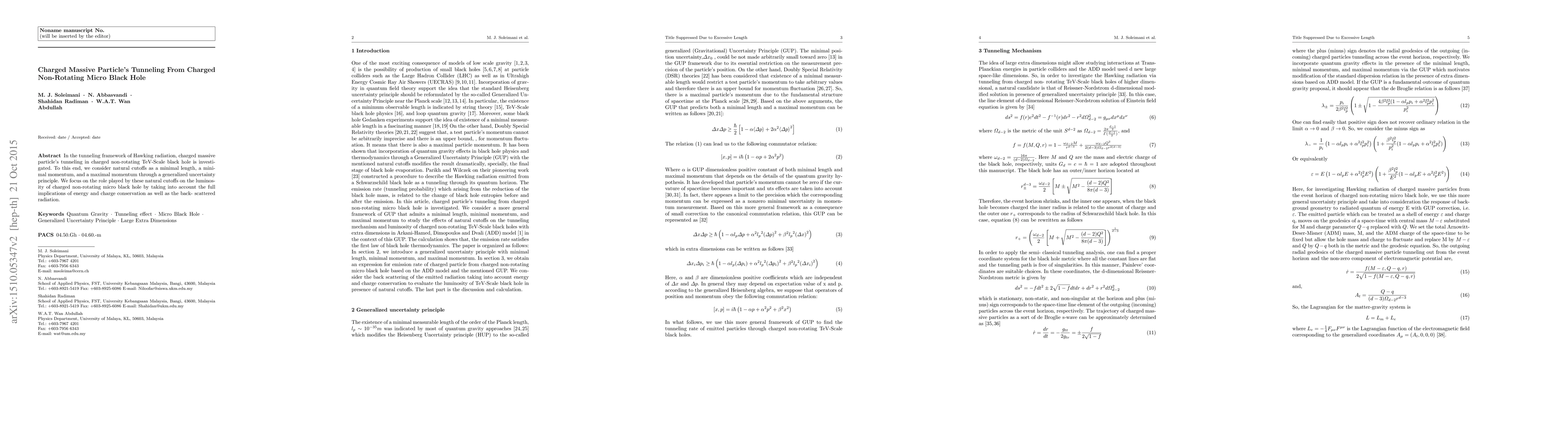 In the tunneling framework of Hawking radiation, charged massive particle's tunneling in charged non-rotating TeV-Scale black hole is investigated. To this end, we consider natural cutoffs as a minimal length, a minimal momentum, and a maximal momentum through a generalized uncertainty principle. We focus on the role played by these natural cutoffs on the luminosity of charged non-rotating micro black hole by taking into account the full implications of energy and charge conservation as well as the back- scattered radiation.