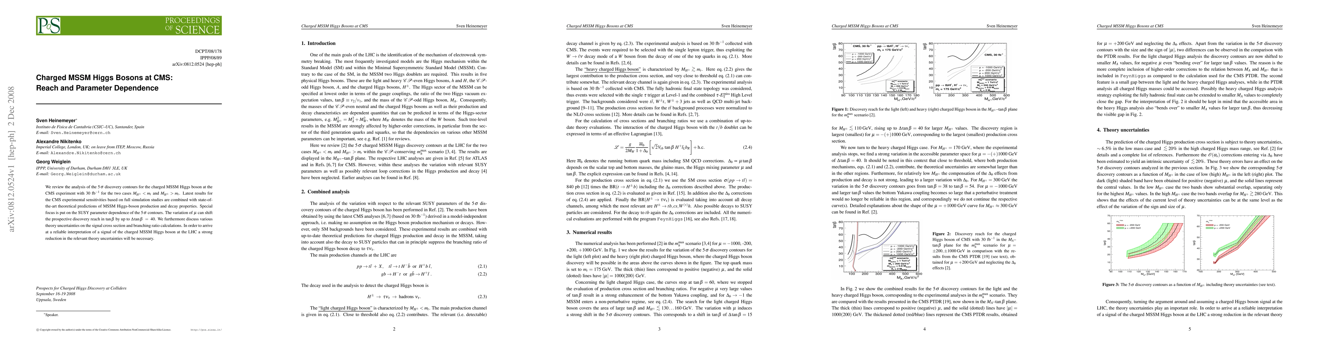 This paper examines the CMS experimental reach for discovering charged MSSM Higgs bosons with 30 fb^-1 of data, analyzing the parameter dependence on the 5 sigma discovery contours. It highlights that variations in the SUSY parameter mu can shift the discovery reach by up to Delta tan_beta = 40, emphasizing the need for reduced theory uncertainties for reliable signal interpretation.