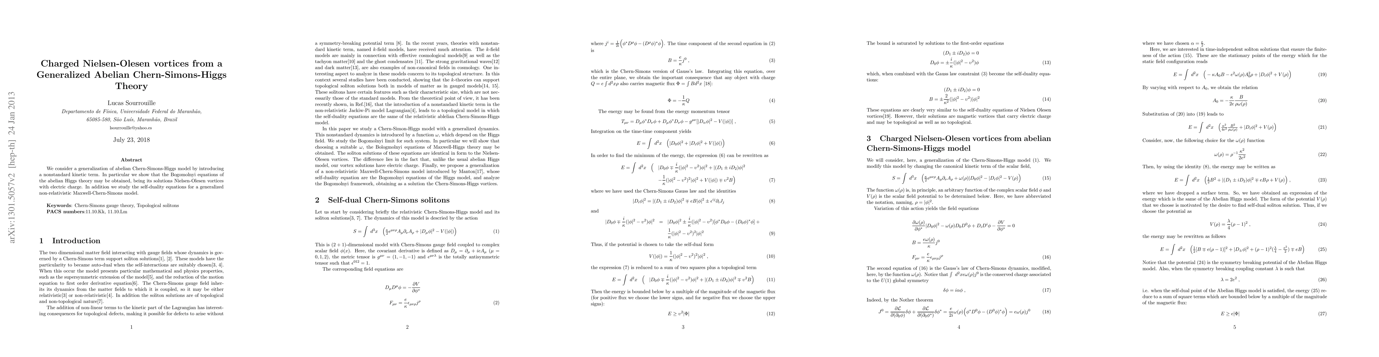 This paper generalizes the abelian Chern-Simons-Higgs model with a nonstandard kinetic term, demonstrating that it yields Nielsen-Olesen vortices with electric charge as solutions to the Bogomolnyi equations. It also examines self-duality in a generalized non-relativistic Maxwell-Chern-Simons model.